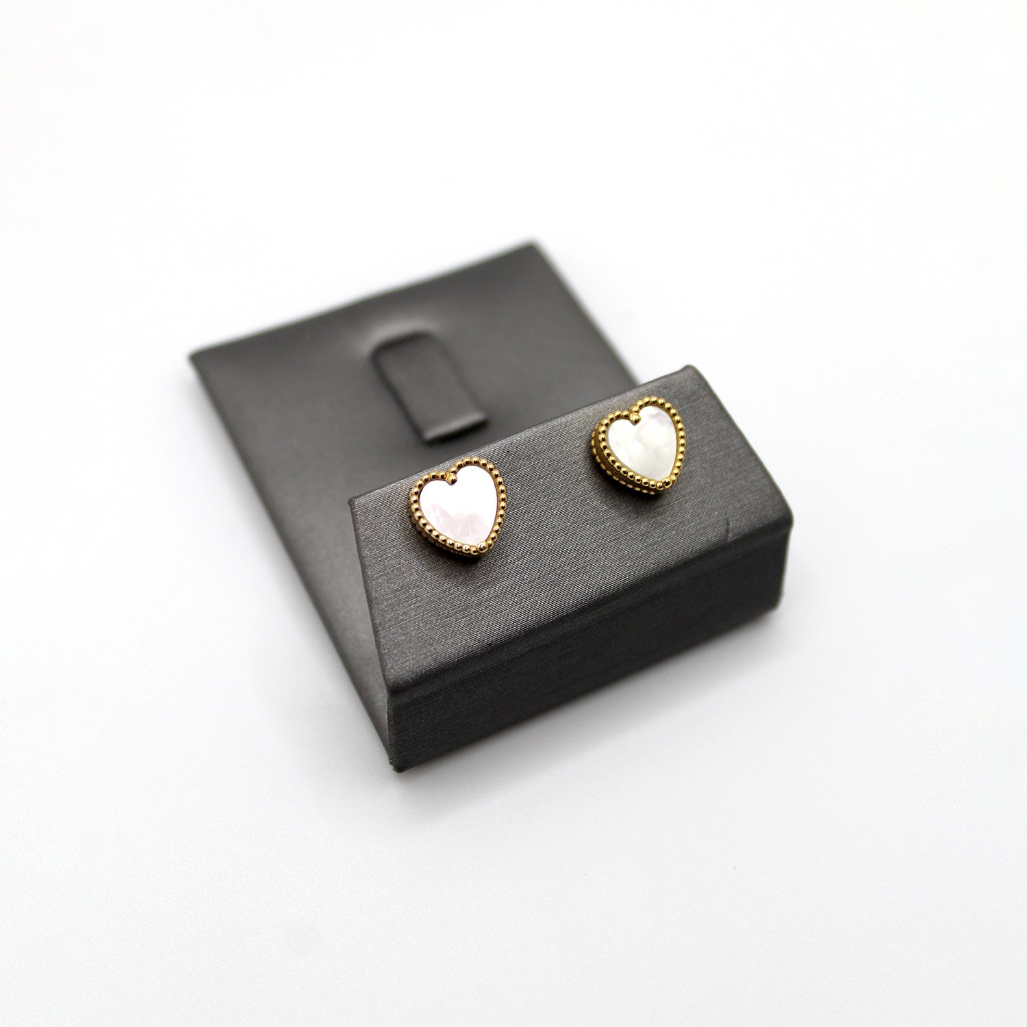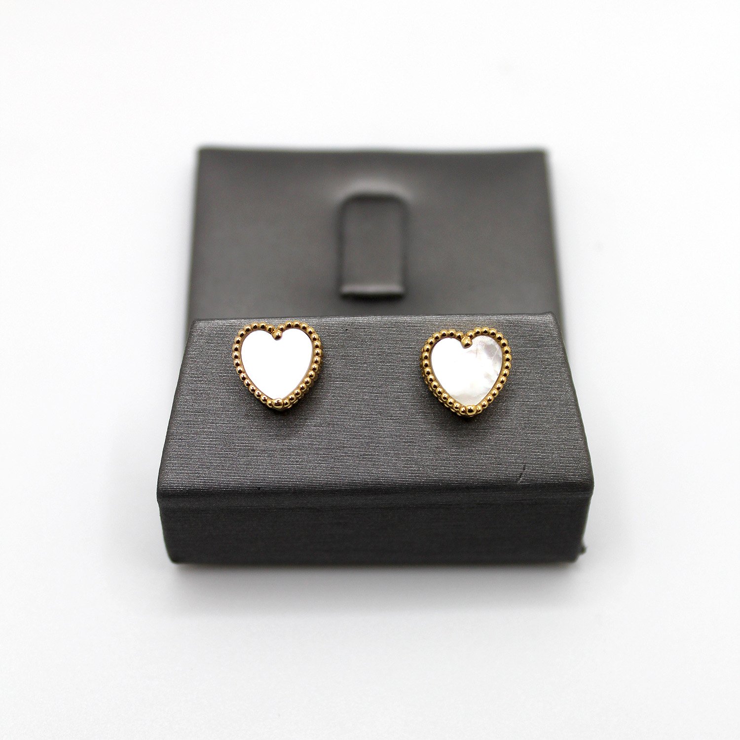 Elegant 10KT yellow gold stud earrings featuring lustrous heart-shaped mother of pearl inlays framed by a delicate beaded gold border.