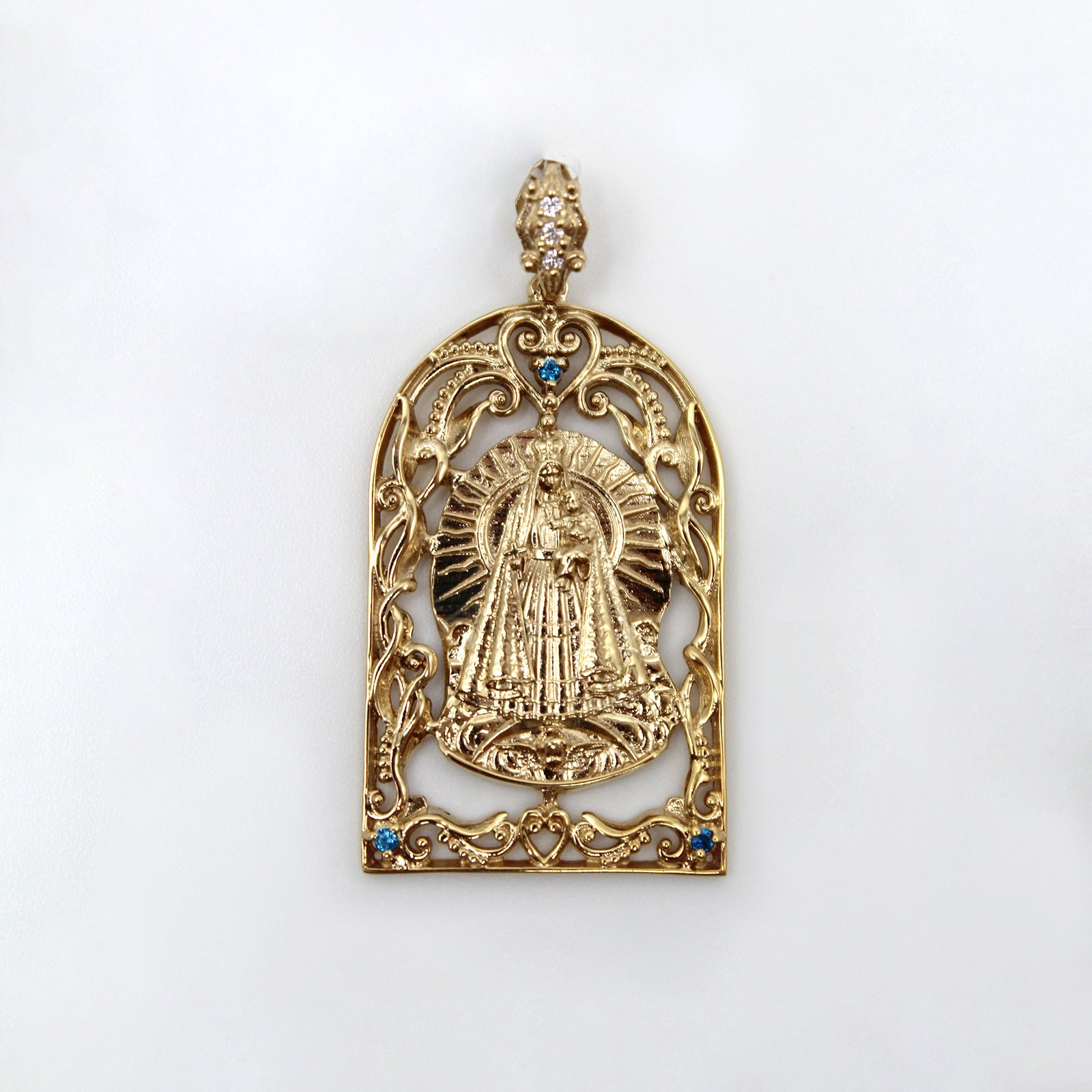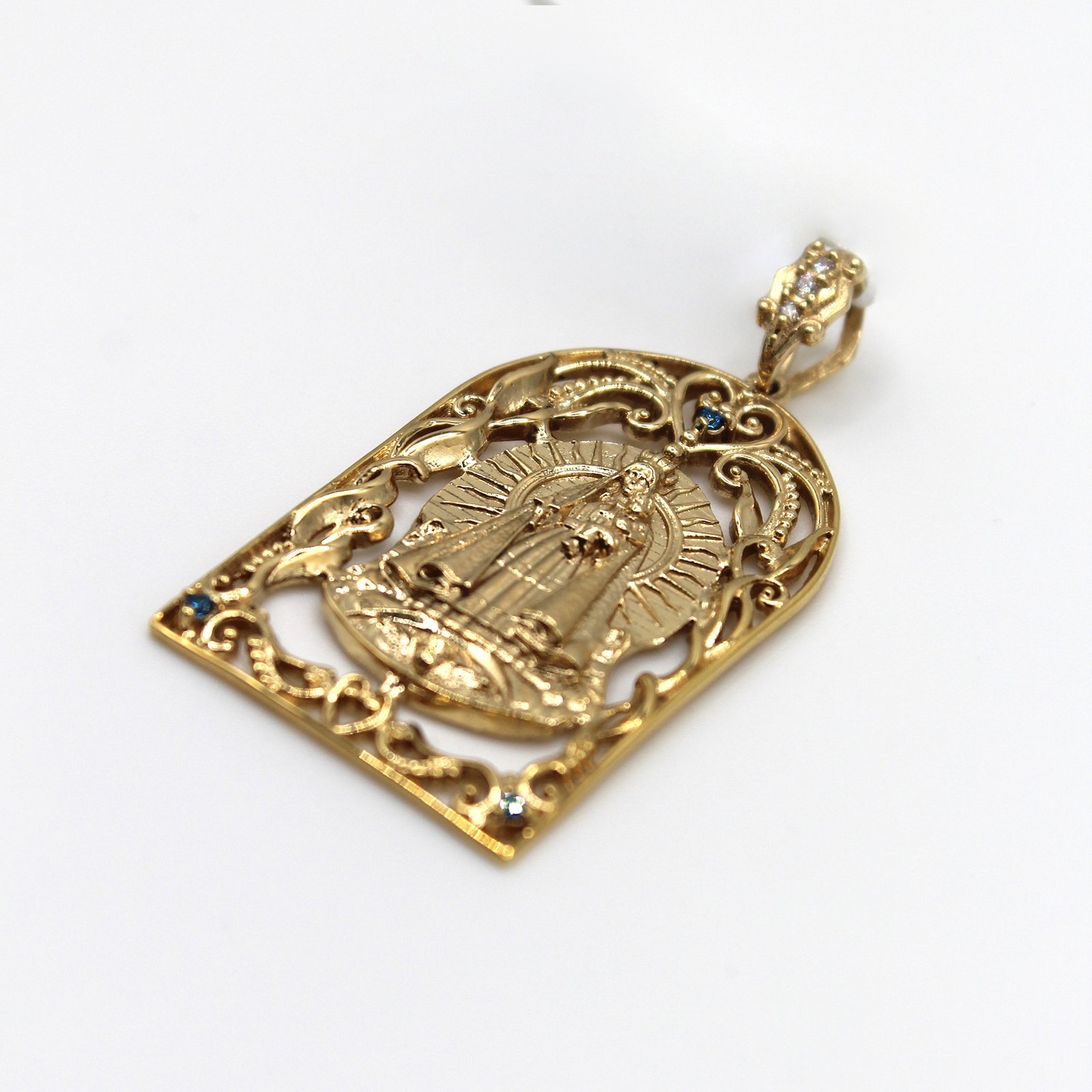 This magnificent 10KT gold pendant is a striking piece of religious jewelry, showcasing a highly dimensional and detailed depiction of the Virgen de la Caridad. The central image is framed by an elaborate, open-work filigree design, creating a regal, arched enclosure. The intricate gold work is subtly enhanced with small blue stones and clear stones near the bail and base, adding a touch of color and sparkle. Its substantial size and weight make it a profound statement piece, perfect for honoring the patroness of Cuba.