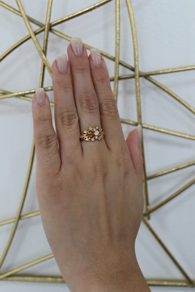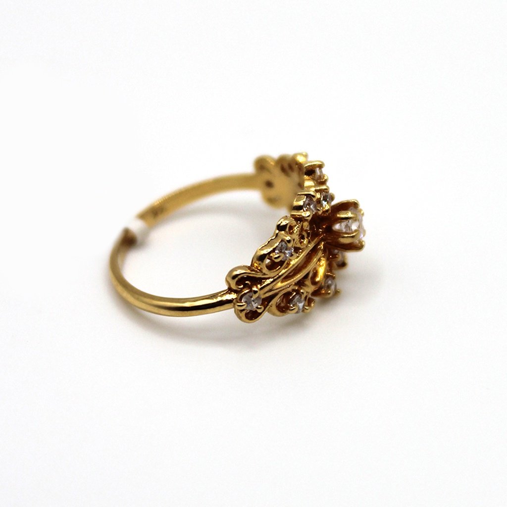 This 14KT gold ring showcases an intricate filigree design, highlighting a radiant central clear stone surrounded by a cluster of smaller stones for added brilliance. The ornate band adds a vintage-inspired charm, making this ring a versatile piece that can be worn as an everyday accessory or for special occasions. Its timeless beauty makes it an excellent gift or heirloom-worthy addition to your collection.