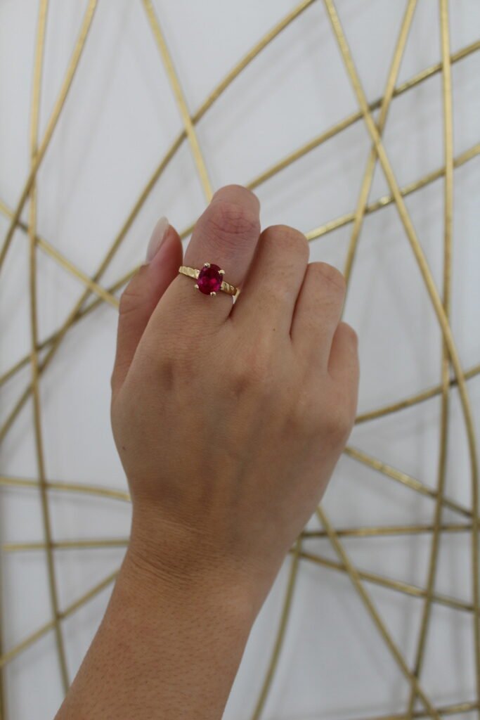 This 10KT gold ring is set with a stunning oval red stone that radiates elegance and sophistication. The polished band adds a refined touch, making this piece a perfect statement accessory for both everyday wear and special occasions. Its vibrant gemstone ensures it stands out as a symbol of passion and style.