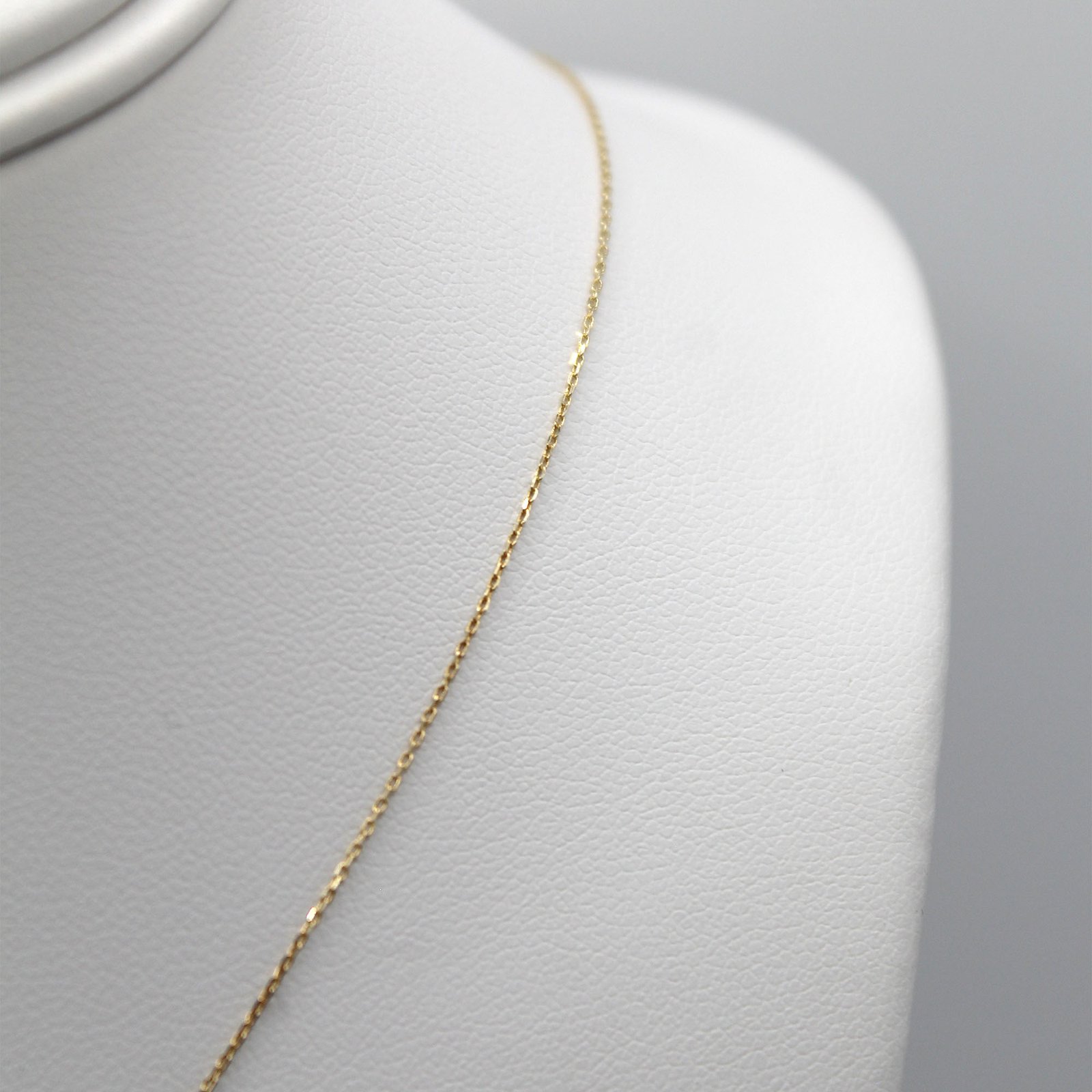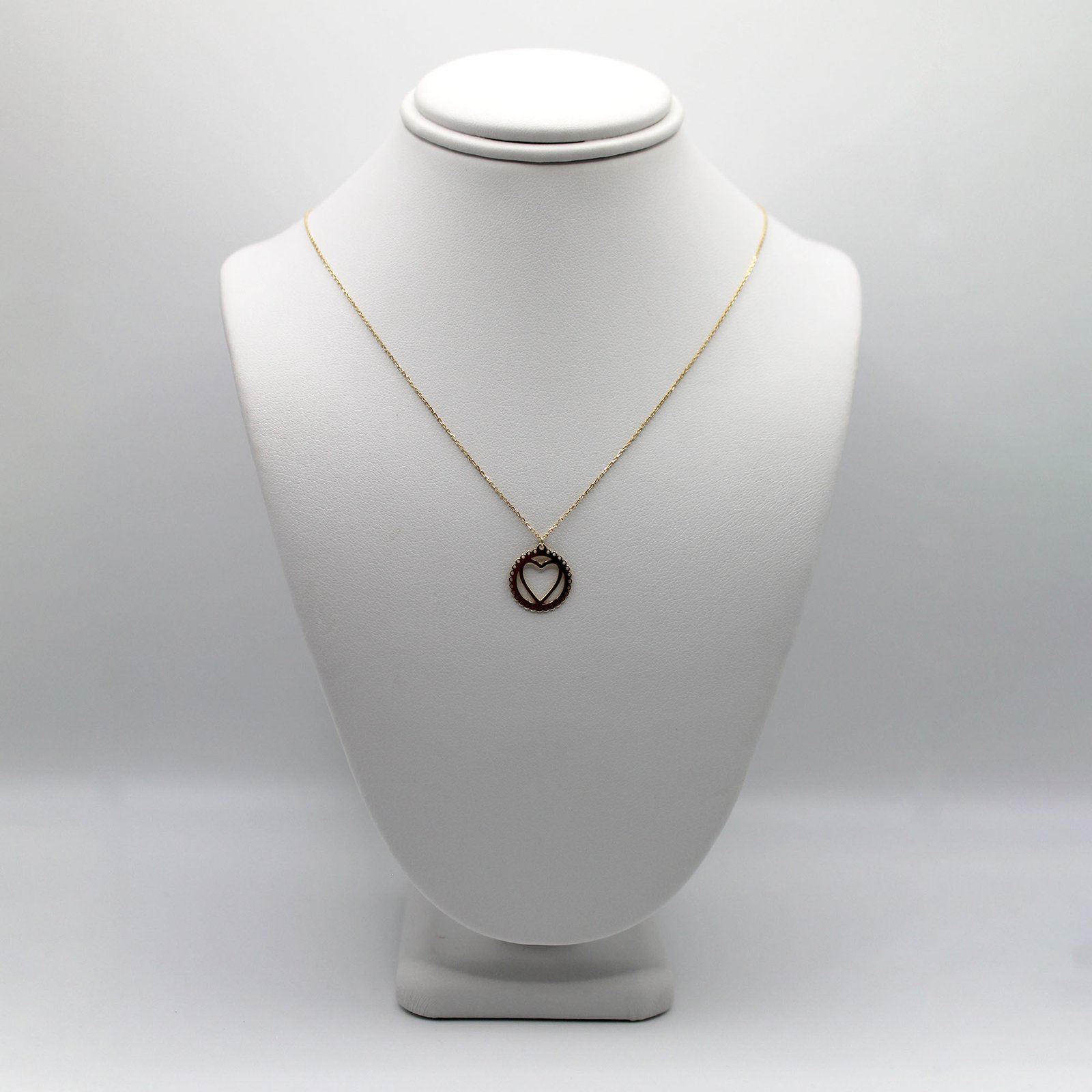Crafted in fine 14KT yellow gold, this women’s necklace offers a charming, dimensional design. It features a fine link chain suspending a miniature round pendant. The outer edge of the circle is intricately set with small, dark color stones (appearing black or deep brown), providing a dramatic sparkle. Within this frame, a smooth, polished gold heart silhouette is set, creating a unique contrast between the sparkling border and the polished center. This necklace is lightweight and perfect for wearing alone as a daily accent or for layering with other necklaces.