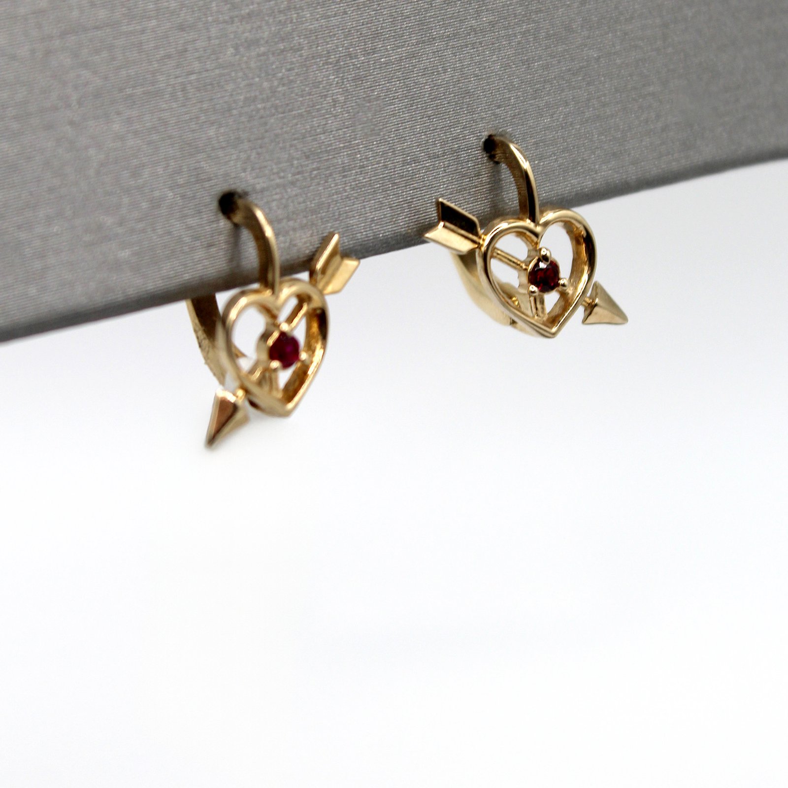 Crafted in warm 10KT yellow gold, these women’s earrings are a charming and unique accessory. They feature a delightful drop design where a delicate, open heart silhouette is symbolically pierced by a polished gold arrow. At the center of the heart, a small, round red color stone is set to add a pop of vibrant color and sparkle. The earrings hang from a simple post or petite hoop component (hinged leverback closure is implied by the style), allowing the pendant to move gently. These whimsical and lightweight earrings are perfect for adding a touch of romantic flair to any everyday or special occasion look.