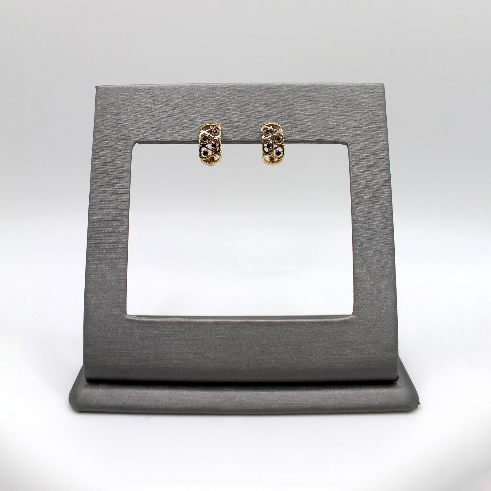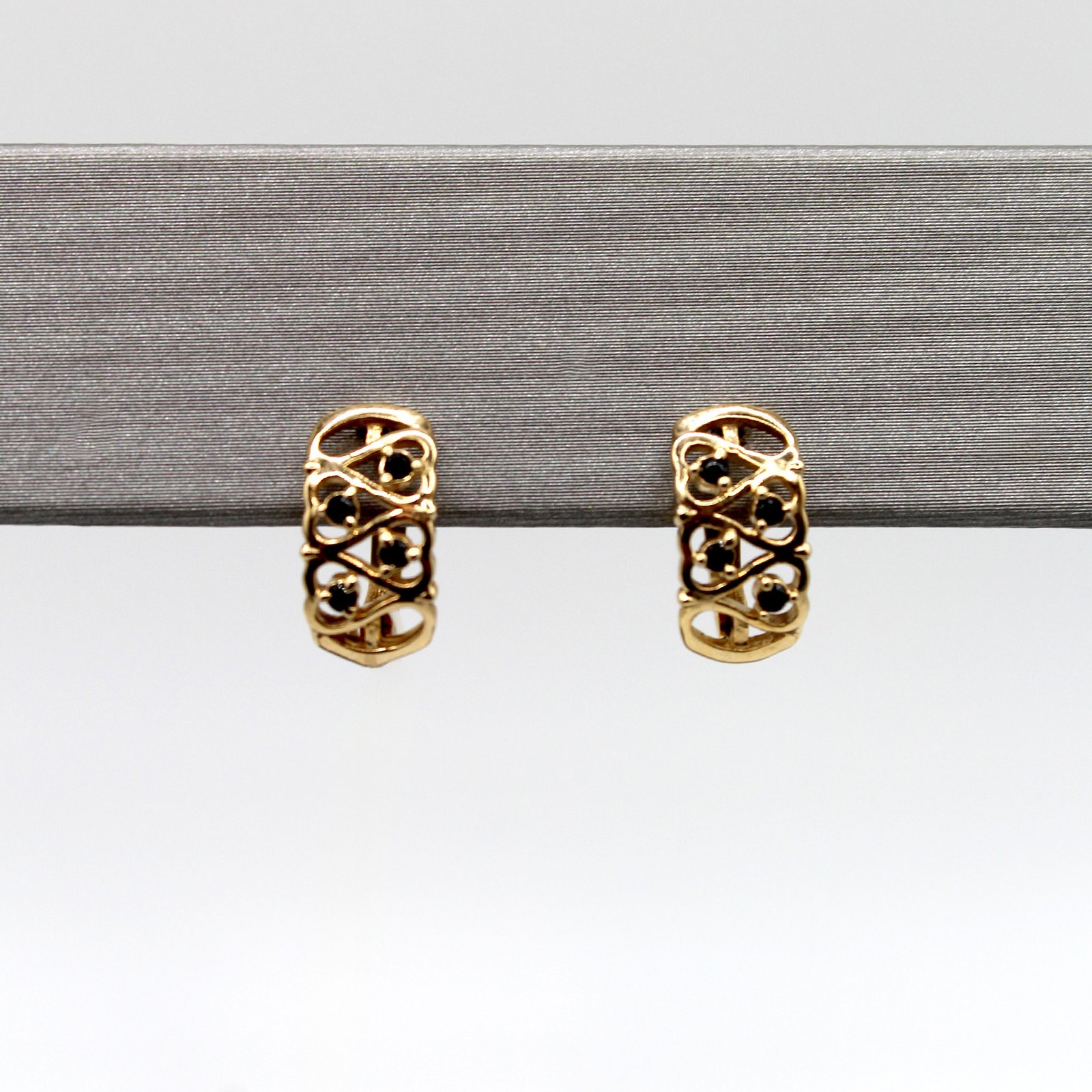 Crafted in warm 10KT yellow gold, these women’s earrings offer exceptional detail in a compact design. The small, comfortable huggie hoop silhouette is distinguished by an intricate open lattice or crisscross pattern across the front surface. Tiny black stones are strategically placed within the filigree, adding subtle sparkle and dramatic contrast to the polished gold. Secured with a discrete hinged closure, these versatile earrings are perfect for adding rich texture, a touch of dark sparkle, and sophisticated detail to an everyday look.