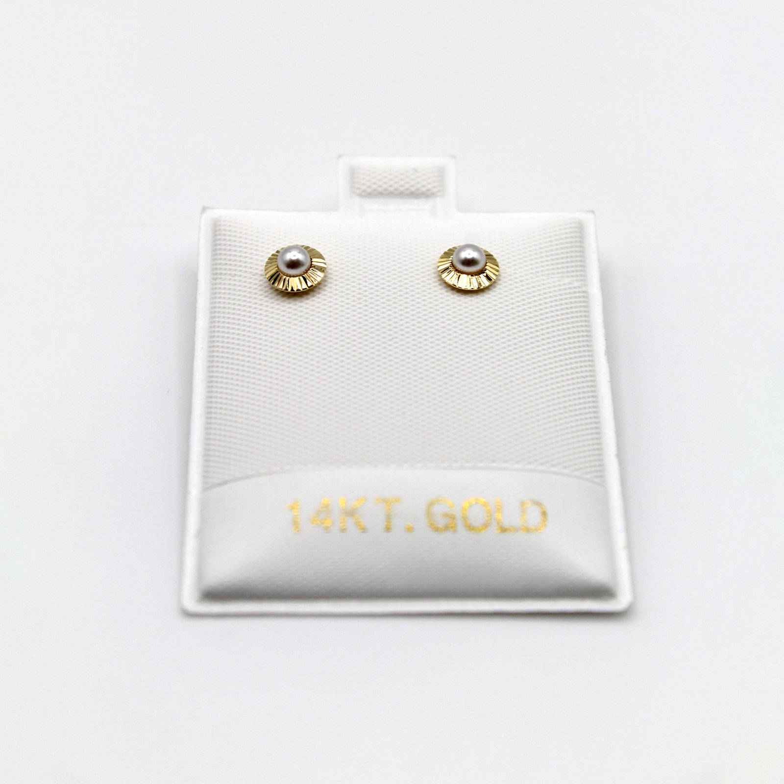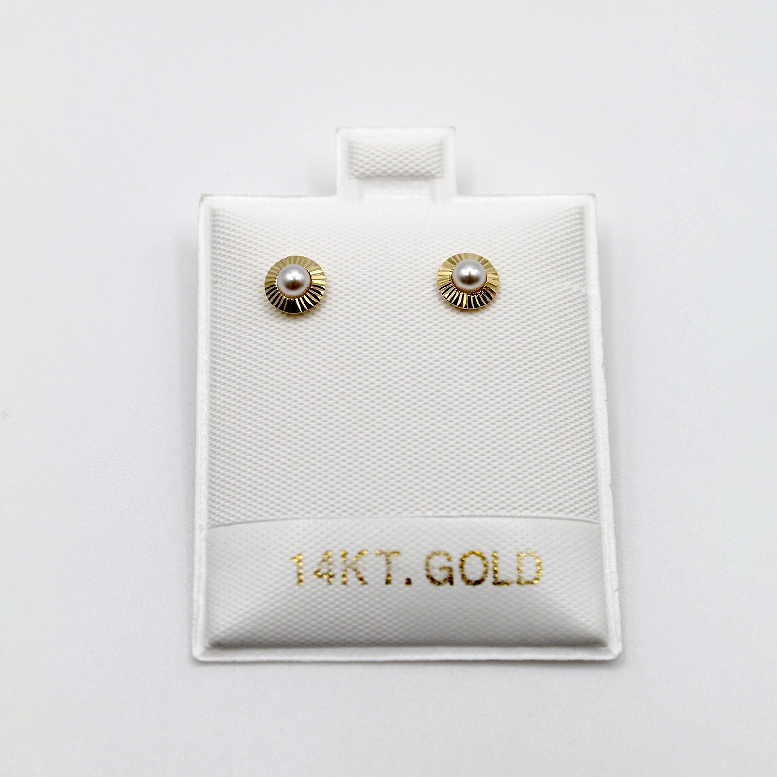 These 14kt gold pearl stud earrings bring timeless beauty with a modern touch. Each luminous pearl is framed by a detailed sunburst setting, adding depth and sophistication to the classic pearl look. Perfect for everyday elegance or as a refined accent for special occasions.