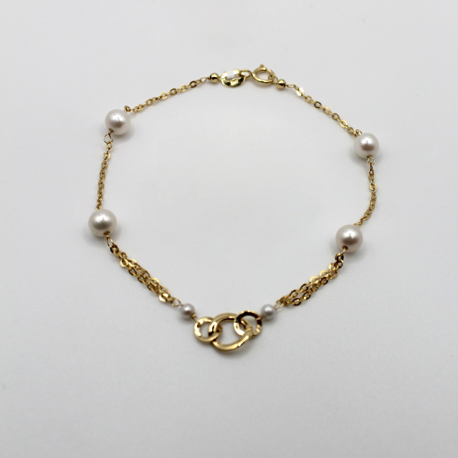 This sophisticated gold bracelet features a light and feminine design. The fine gold chain is accented with station-set cultured pearls, creating a delicate, classic look around the wrist. At the center, two polished gold rings interlock, symbolizing connection and love. Its dainty profile makes it perfect for everyday wear or for layering with other jewelry. This piece combines the timeless beauty of pearls with a meaningful modern charm, making it a beautiful and enduring gift.