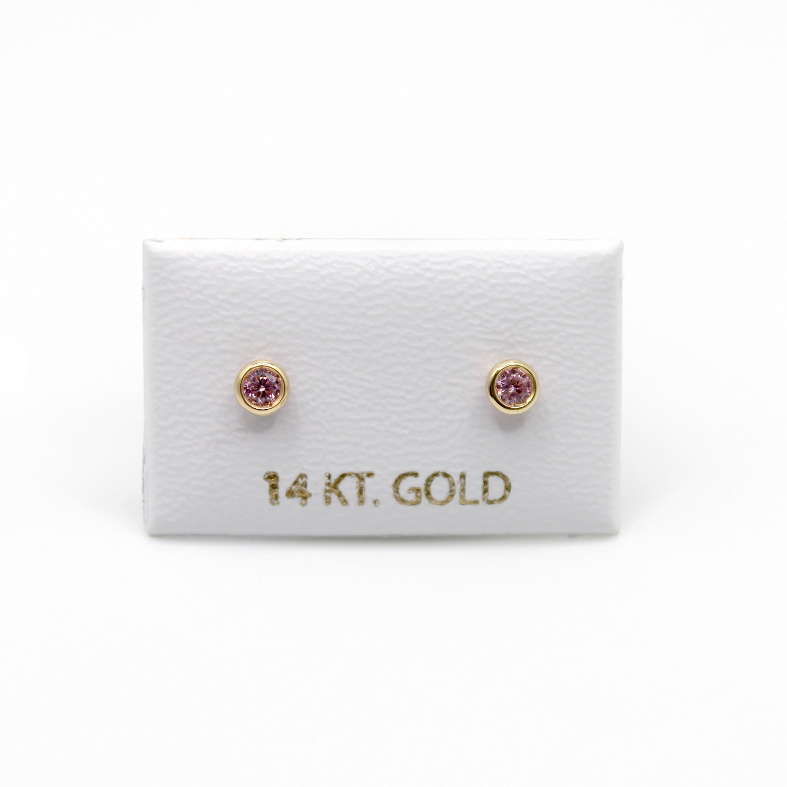 These charming 14KT gold stud earrings feature a bright, beautiful pink round stone that offers a lovely pop of color. The stone is securely set in a smooth, polished gold bezel, a setting style that is modern, low-profile, and excellent for daily wear. The simple yet striking design is perfect for adding a feminine and colorful touch to any look. They are an ideal gift for birthdays or for anyone who appreciates fine jewelry with a cheerful splash of color.