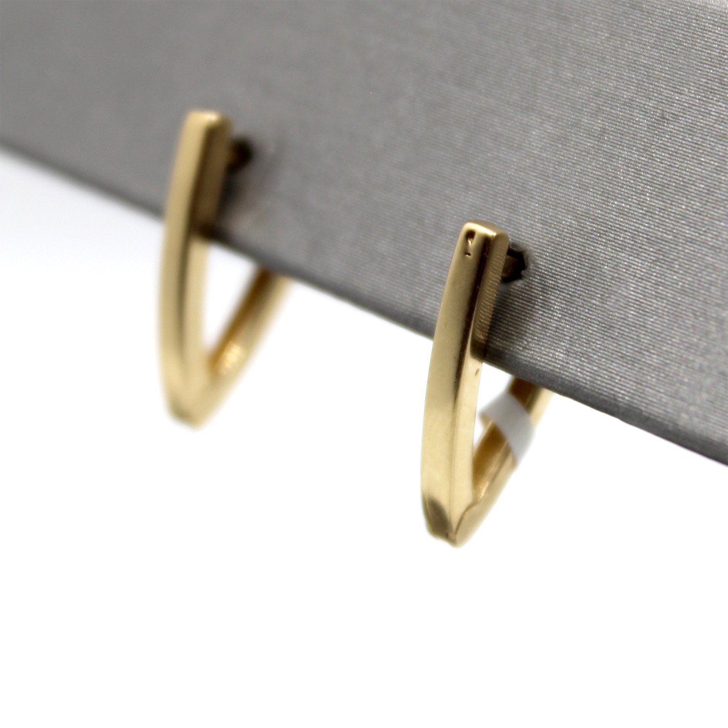 A modern pair of 14KT yellow gold hoop earrings featuring a sharp, triangular “V” silhouette and a brilliant high-polish finish.