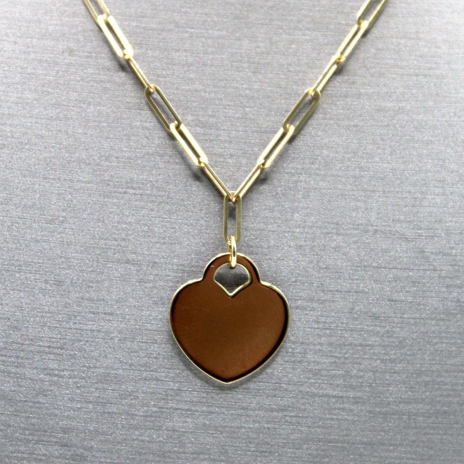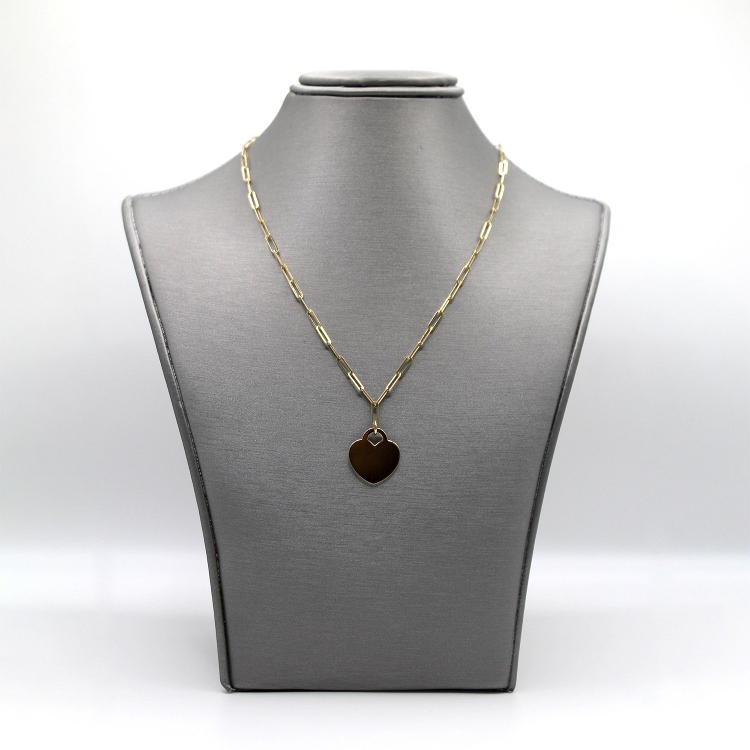 A trendy 14KT yellow gold necklace featuring a sleek paperclip chain and a polished flat heart pendant.