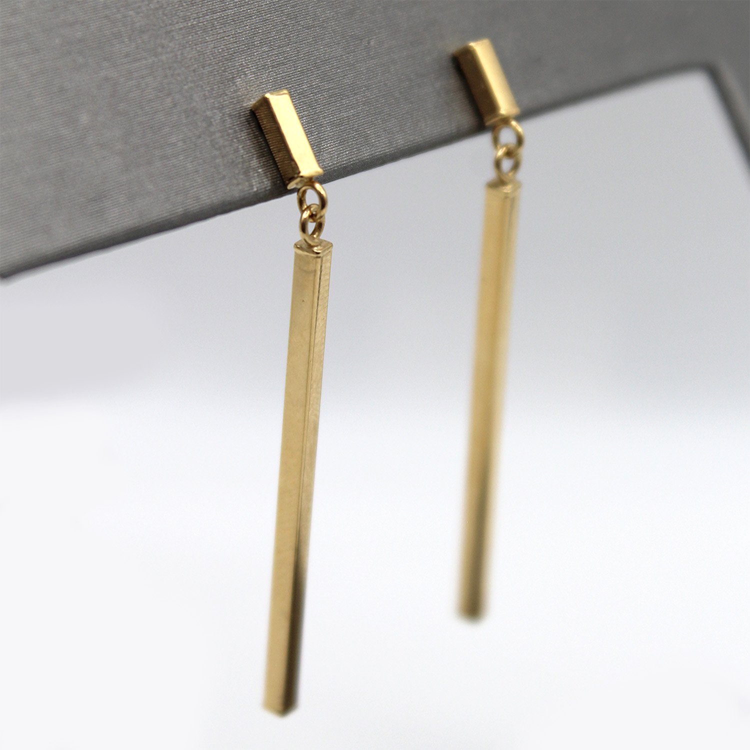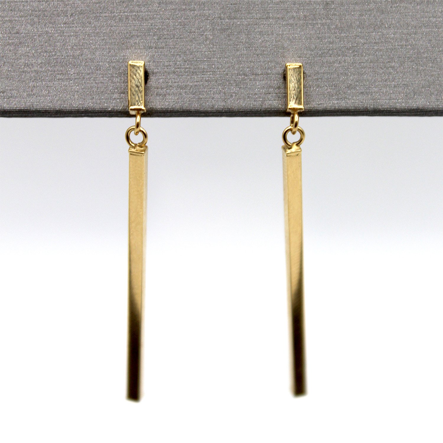 A sleek and modern pair of 14KT yellow gold drop earrings featuring a minimalist linear bar design and a brilliant high-polish finish.