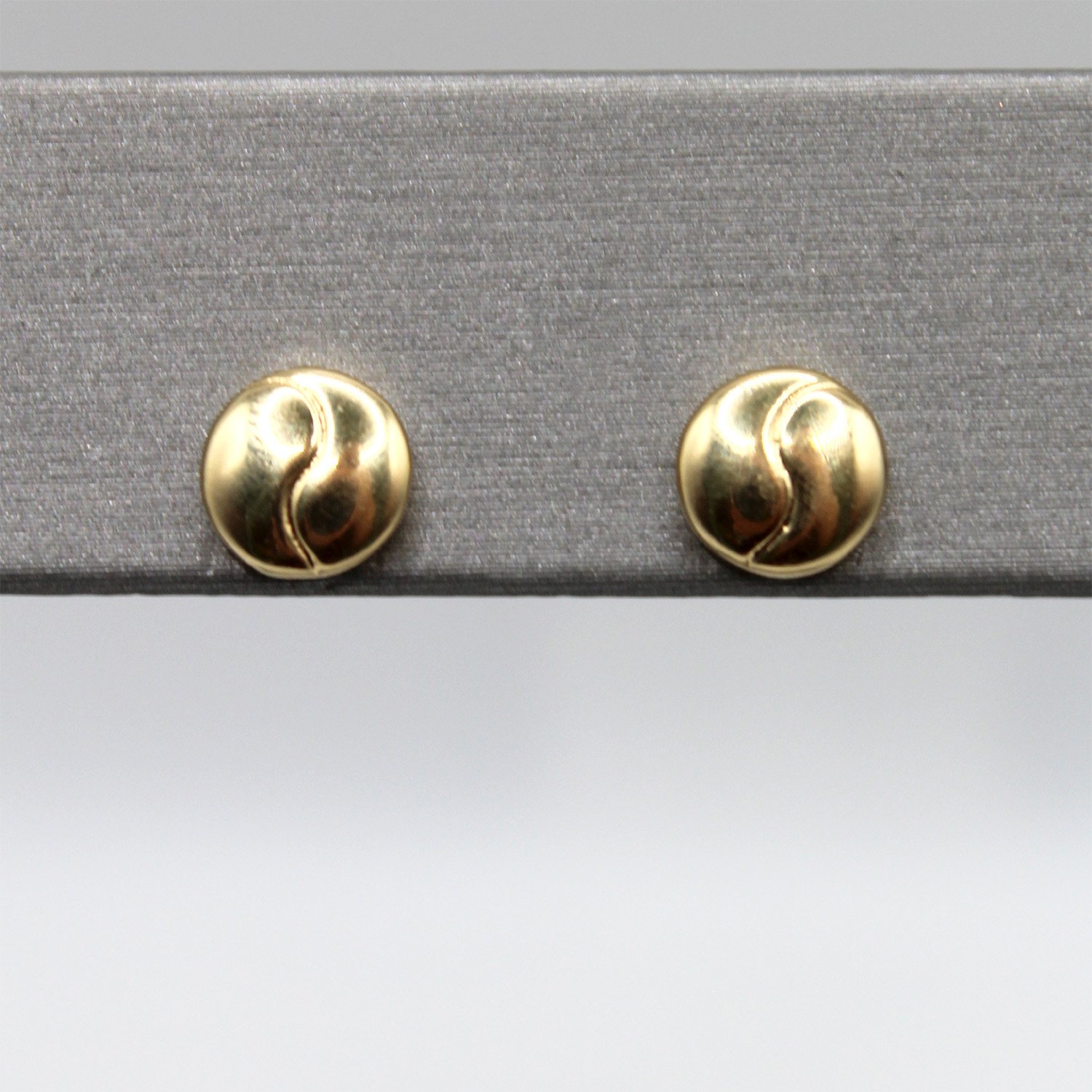 A sophisticated pair of 14KT yellow gold stud earrings featuring a classic circular button shape and an elegant raised swirl motif.