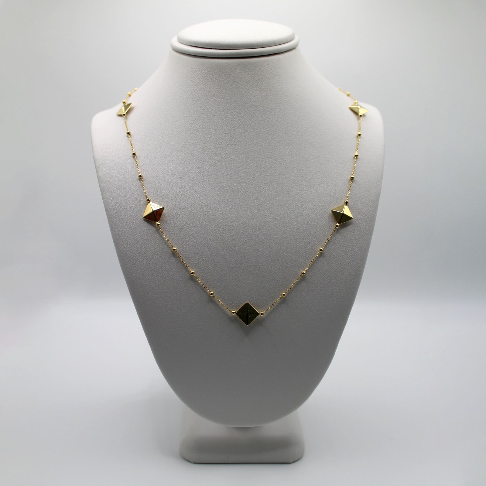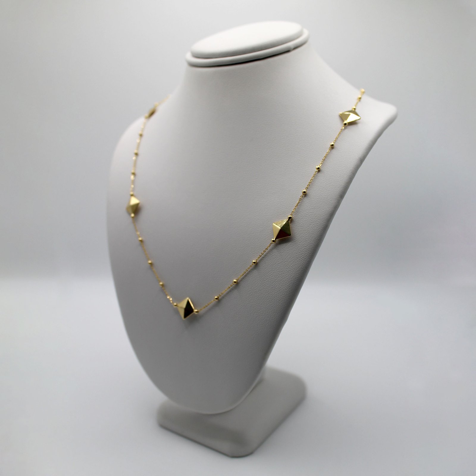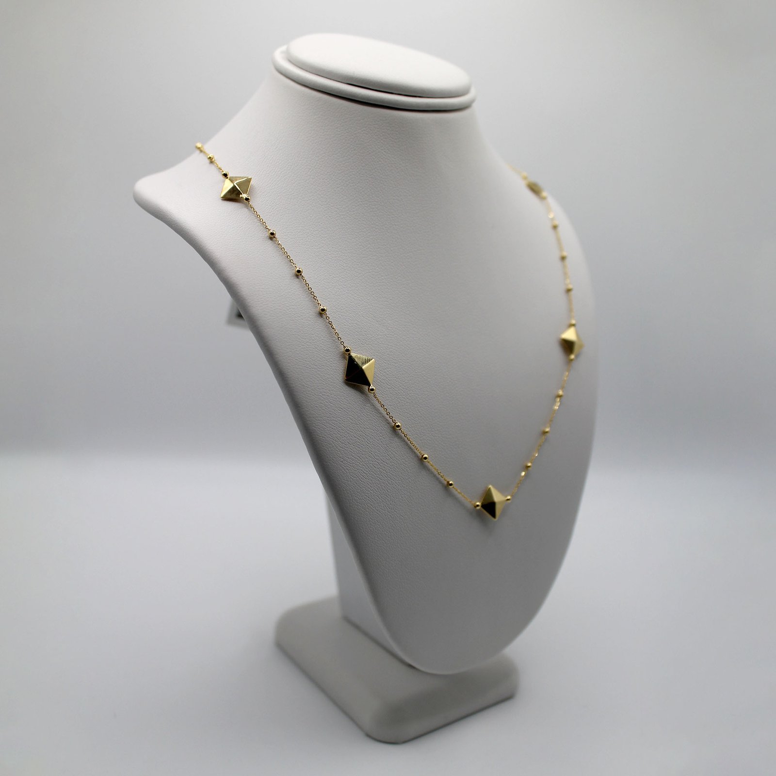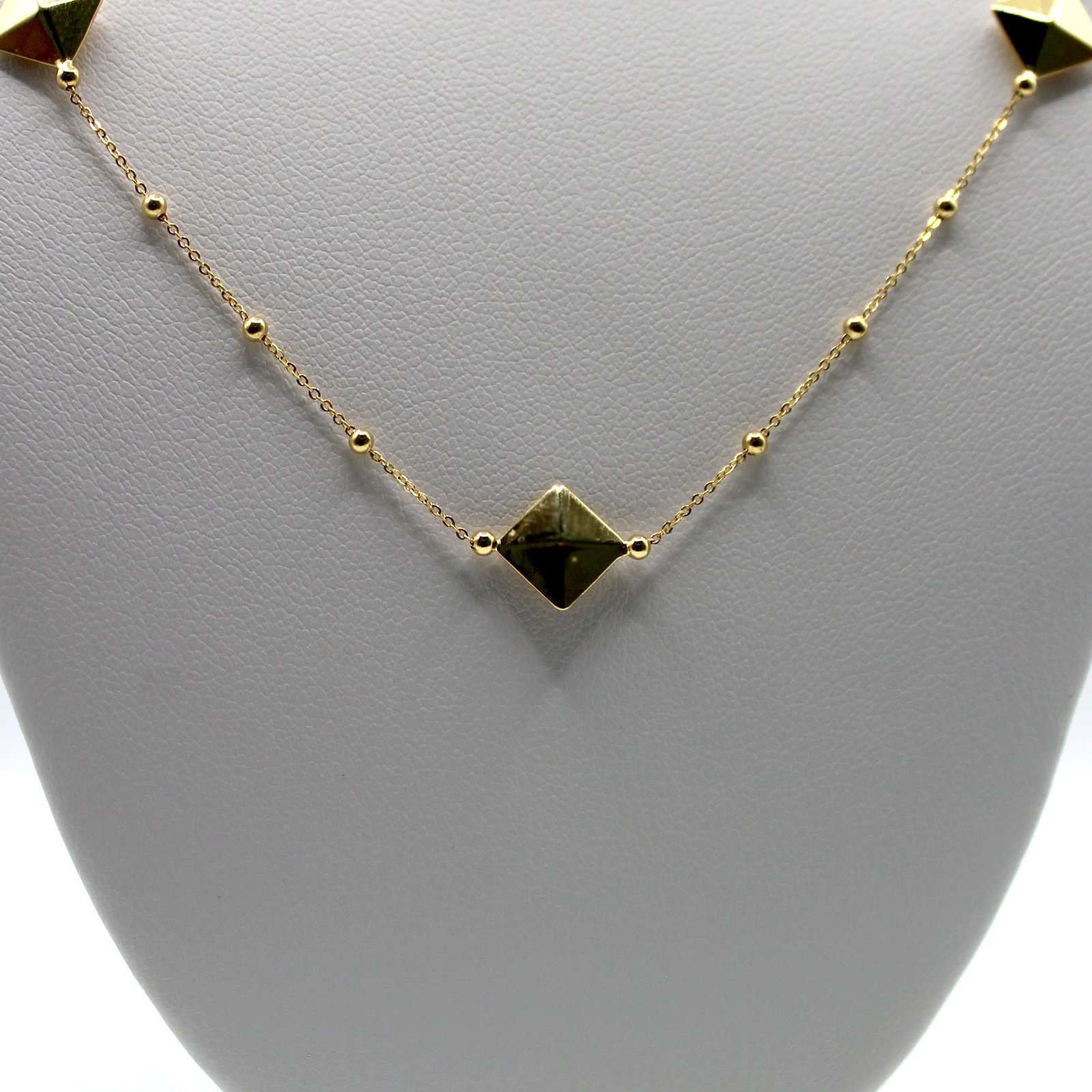 Crafted in fine 14KT yellow gold, this women’s necklace offers a striking, contemporary look. The dainty beaded link chain is adorned with multiple geometric pyramid stud stations that are evenly spaced, adding structure and volume. The central station is a flat, square pyramid shape with a dark color stone inlay (likely black or deep green), providing a contrasting focal point. The combination of the delicate chain, the golden beads, and the bold pyramid studs creates a fashionable, textured look. This piece is perfect for adding modern edge and sophistication to any outfit, worn alone or as part of a layered look.