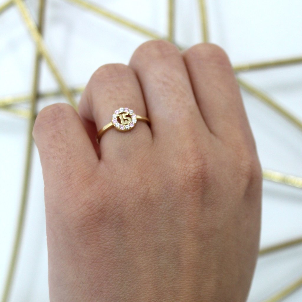 This quinceañera ring is a timeless symbol of tradition and elegance, designed in 14kt gold. At the center sits a bold “15,” representing this cherished milestone, surrounded by a circle of brilliant cubic zirconia stones for a radiant sparkle. The slim, polished band ensures comfort and style, making it perfect for daily wear or as a keepsake piece. A meaningful gift for a young woman stepping into a new chapter, this ring beautifully blends sentiment and sophistication.