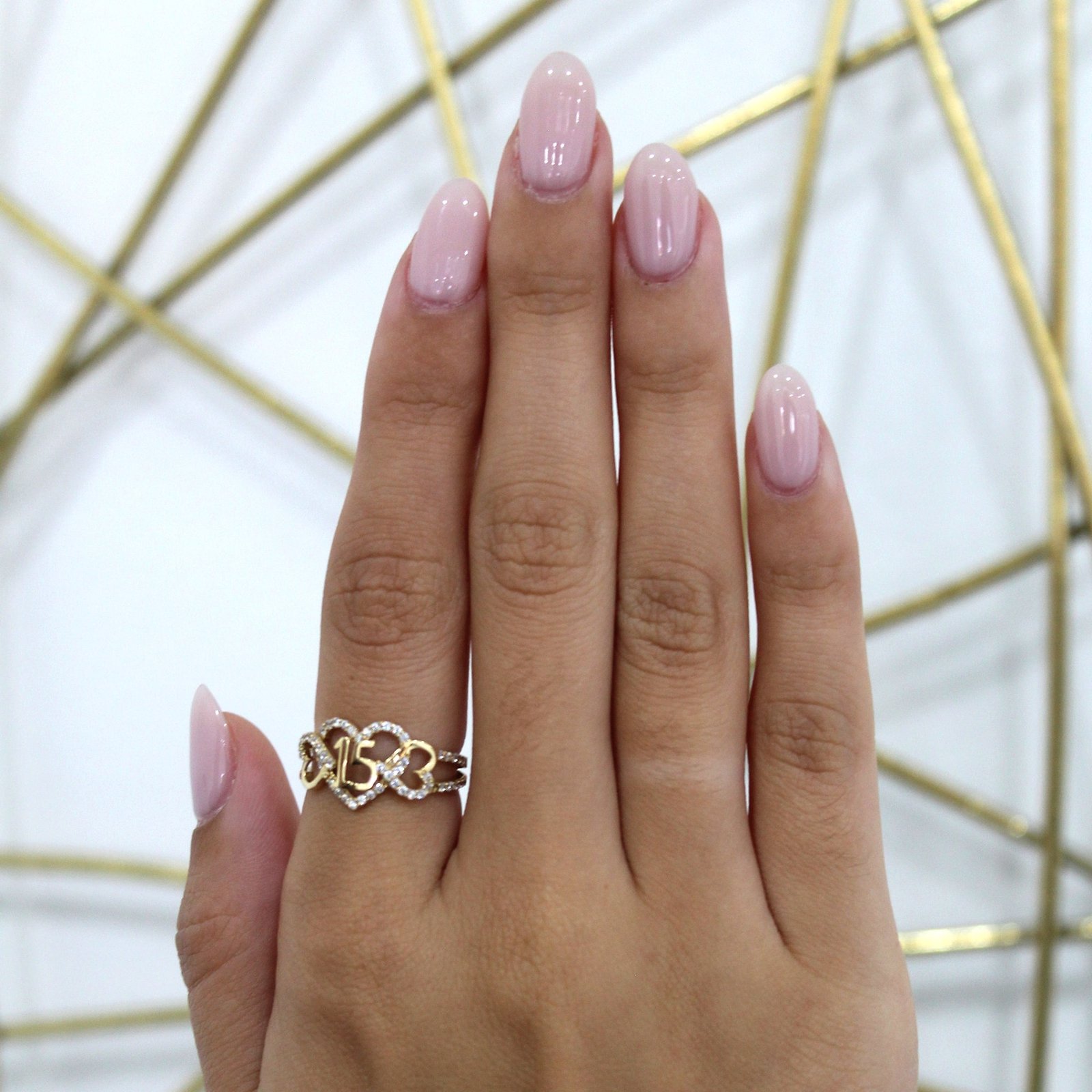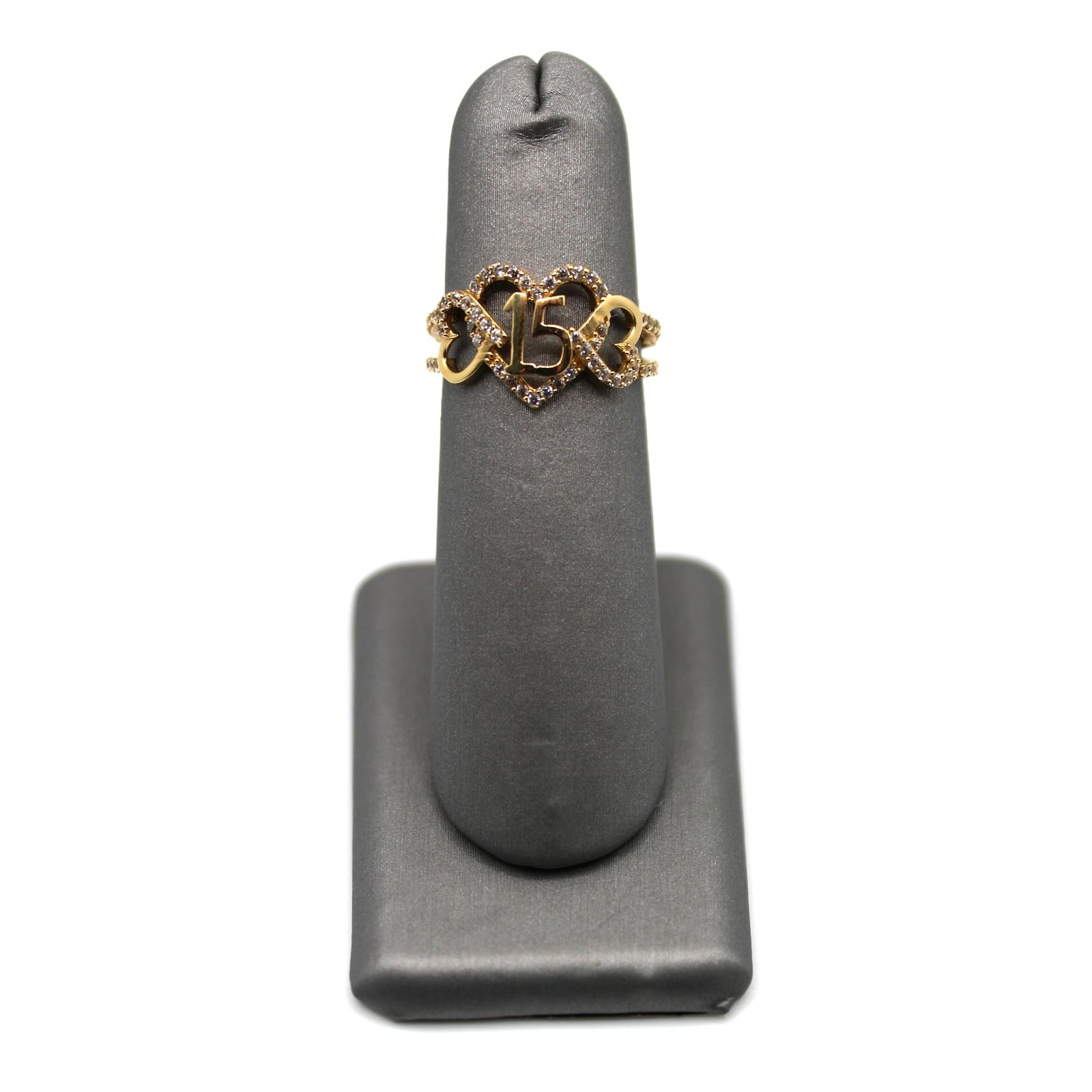 This Quinceañera triple heart ring is a meaningful and elegant gift for her 15th birthday. Beautifully designed in 14kt gold, it features three connected hearts symbolizing love, family, and the special bond of this celebration. The center heart showcases the number 15, surrounded by dazzling stones that add brilliance and charm. With its intricate detailing and timeless design, this ring is the perfect keepsake to honor her coming-of-age and will be cherished for years to come.