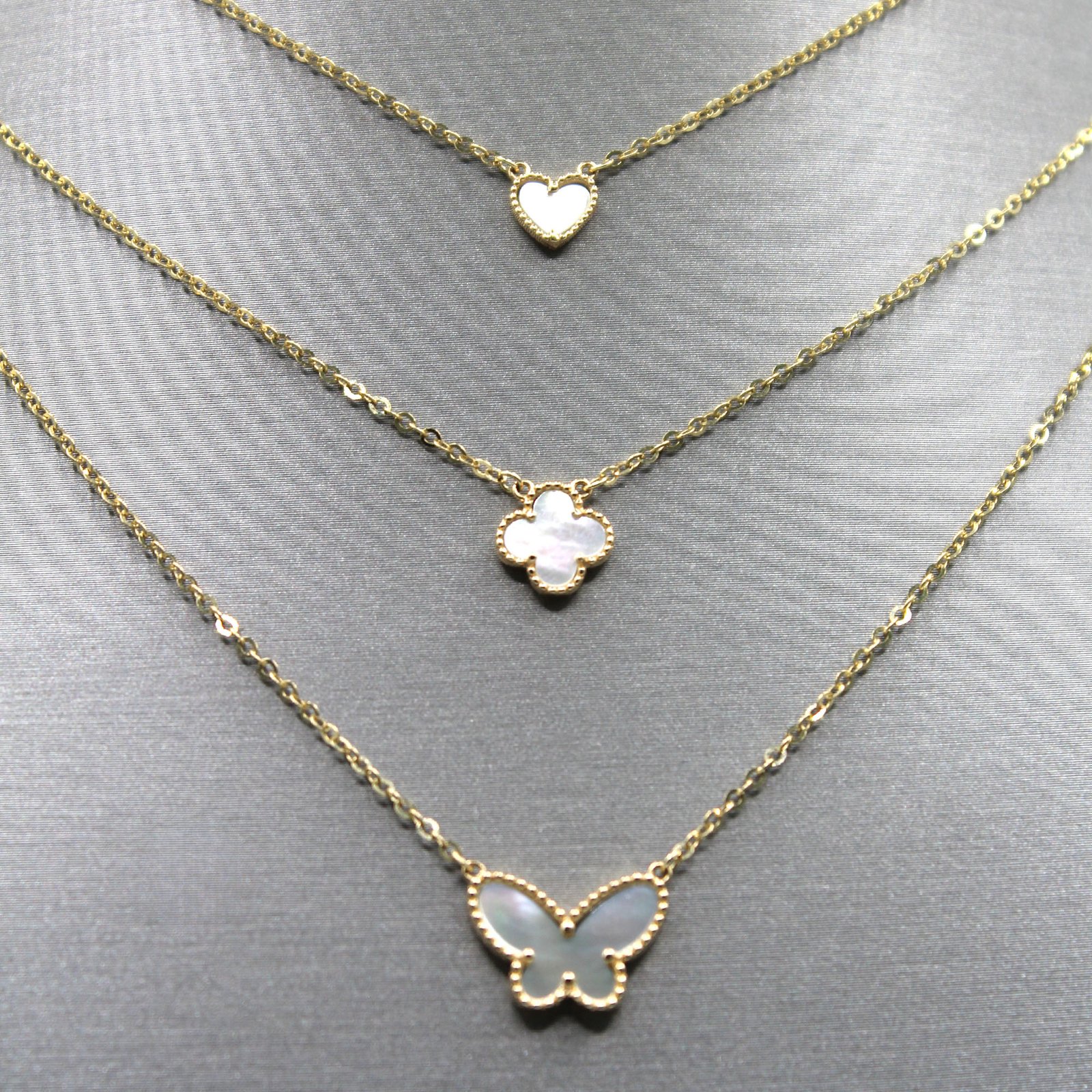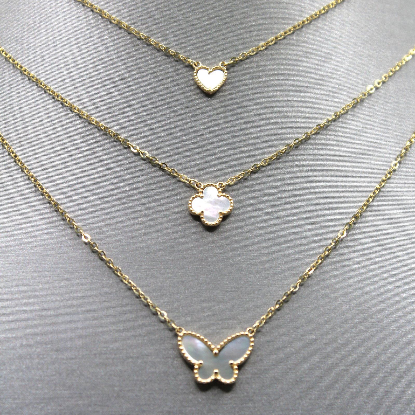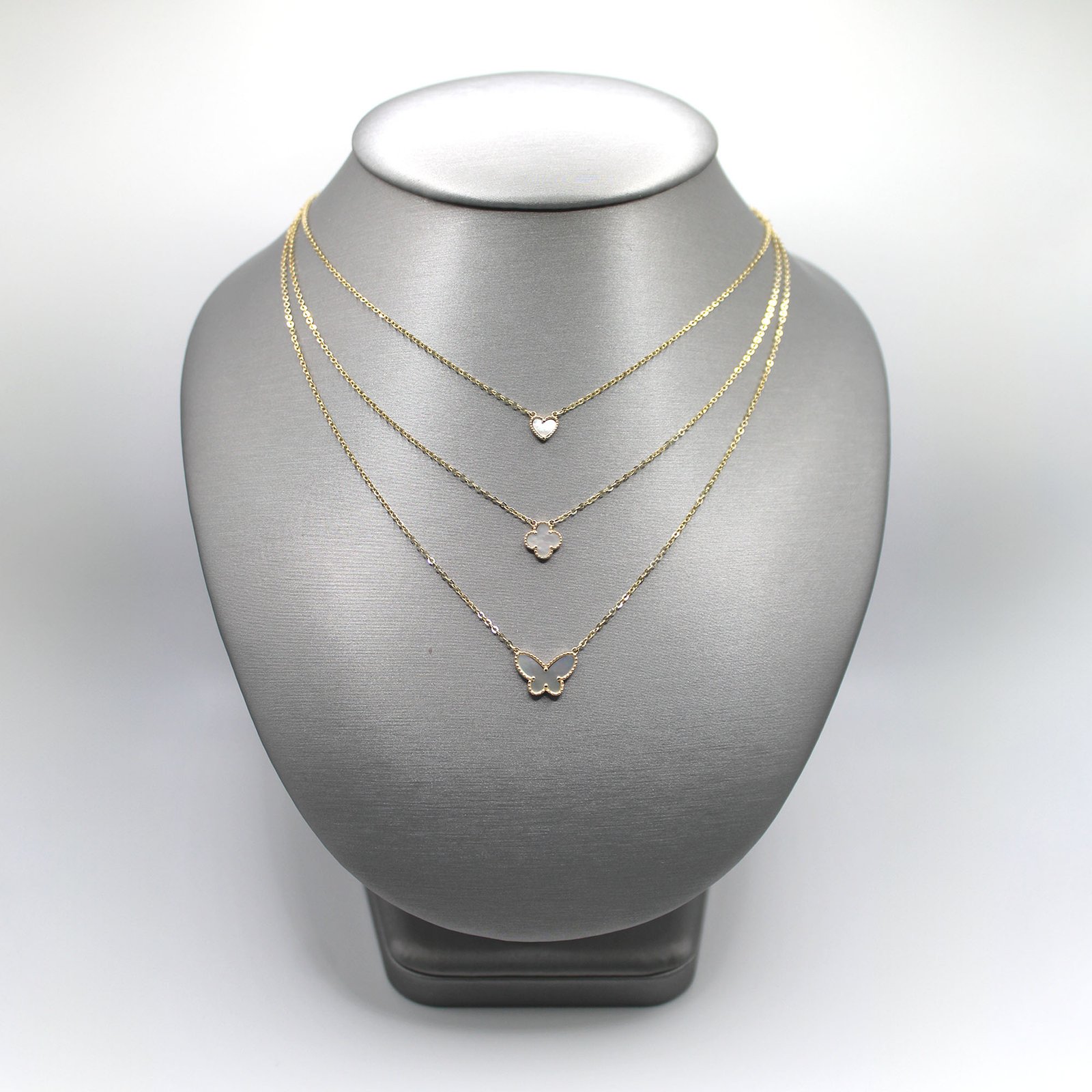 A luminous 14KT gold necklace designed with three delicate layers, each showcasing a unique charm: a heart, a clover, and a butterfly. Its minimalist yet elegant design makes it perfect for everyday wear or as a refined accent for special occasions.