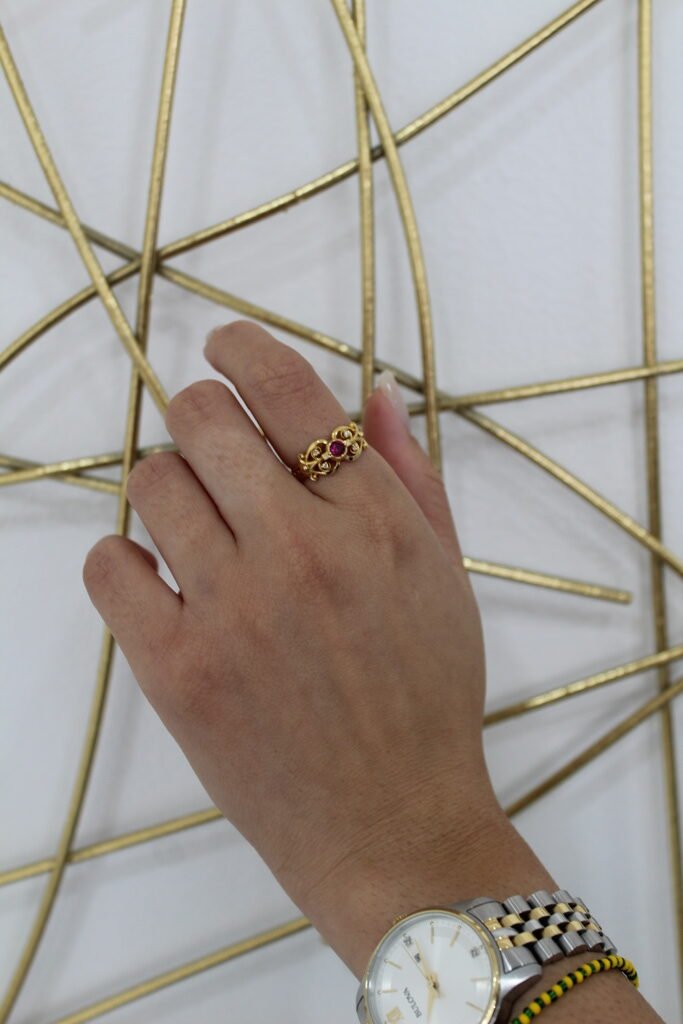 Crafted in 10KT gold, this ring features an elegant filigree design with a striking red stone at the center. Small white stone accents highlight the surrounding scrollwork, adding sparkle and charm to the piece. Its vintage-inspired style makes it a meaningful and timeless gift or a refined addition to your jewelry collection.