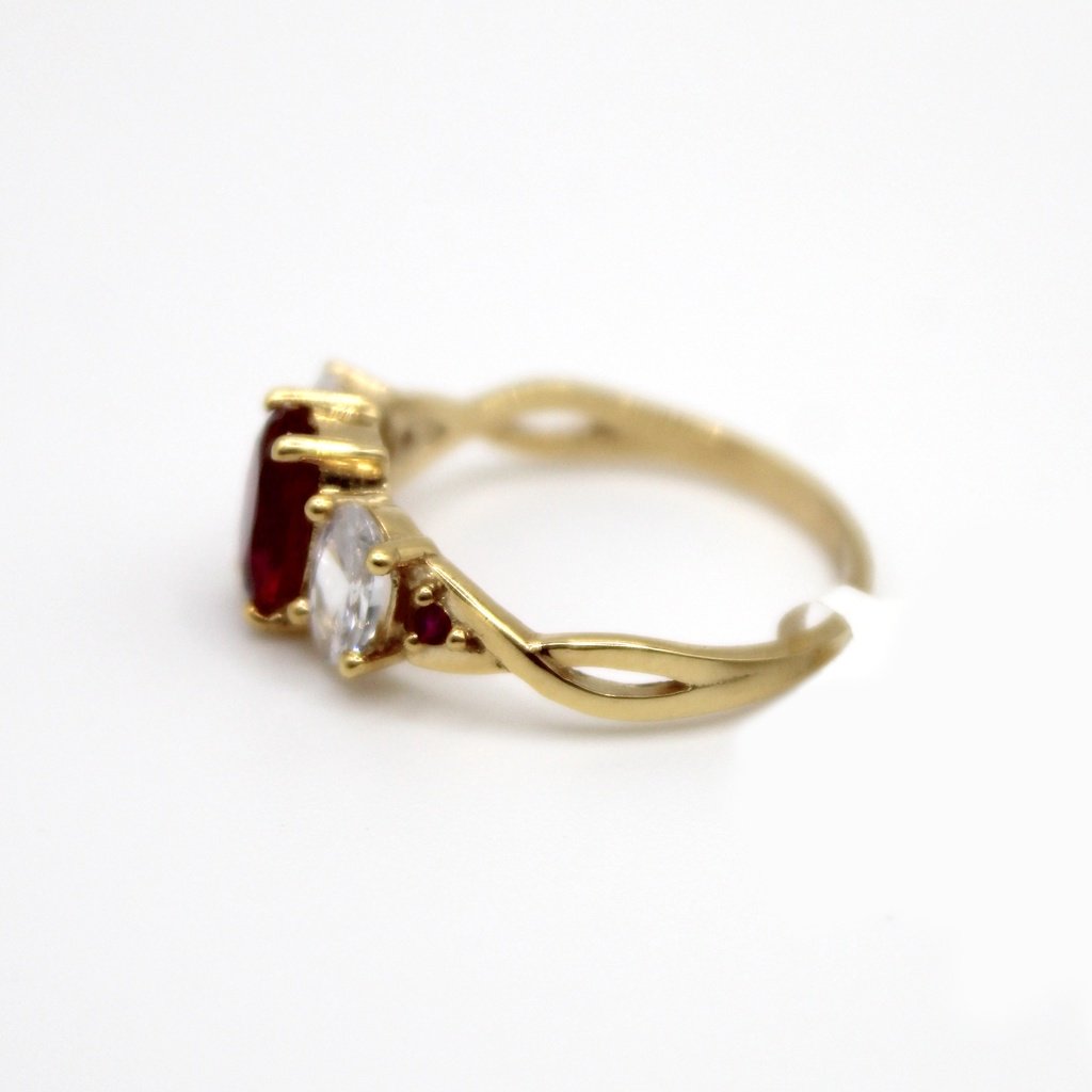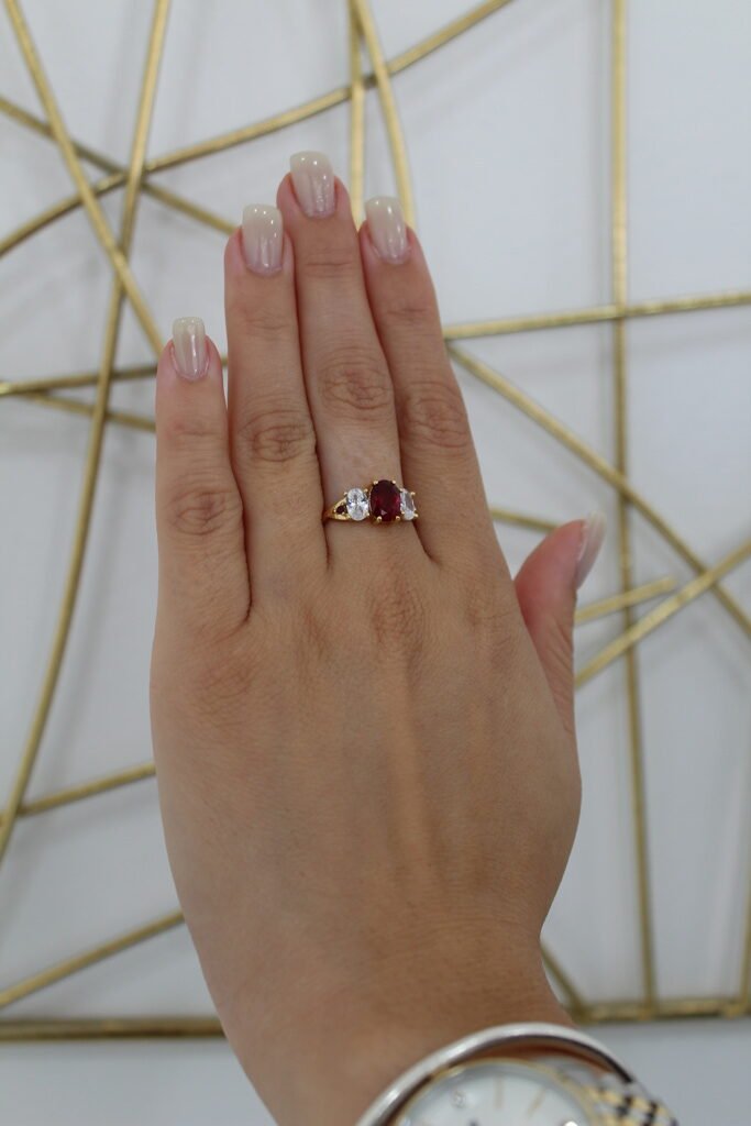 This elegant 10KT gold ring highlights a bold, oval-cut red stone at its center, beautifully flanked by two sparkling clear stones on each side. The contrast between the fiery red and brilliant white stones creates a timeless and eye-catching design. Perfect as a statement ring, promise ring, or a gift for someone special, this piece combines sophistication with everyday wearability.