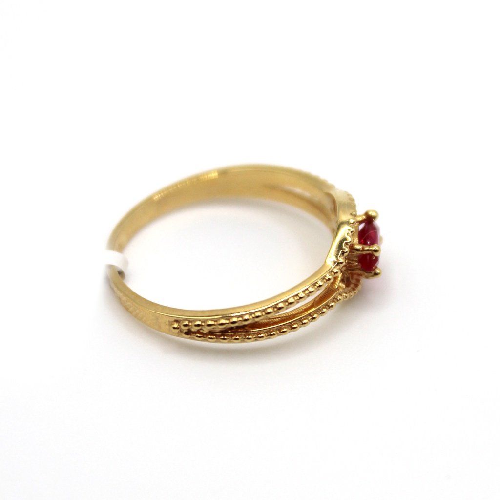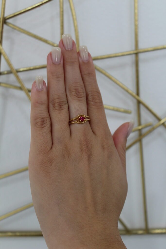 This refined 14KT gold ring highlights a vivid red stone at its center, adding elegance and a touch of bold color. The red stone is framed by a graceful gold design and set on a textured split band, offering both style and uniqueness. Its lightweight yet striking design makes it an excellent choice for everyday wear or as a meaningful gift.