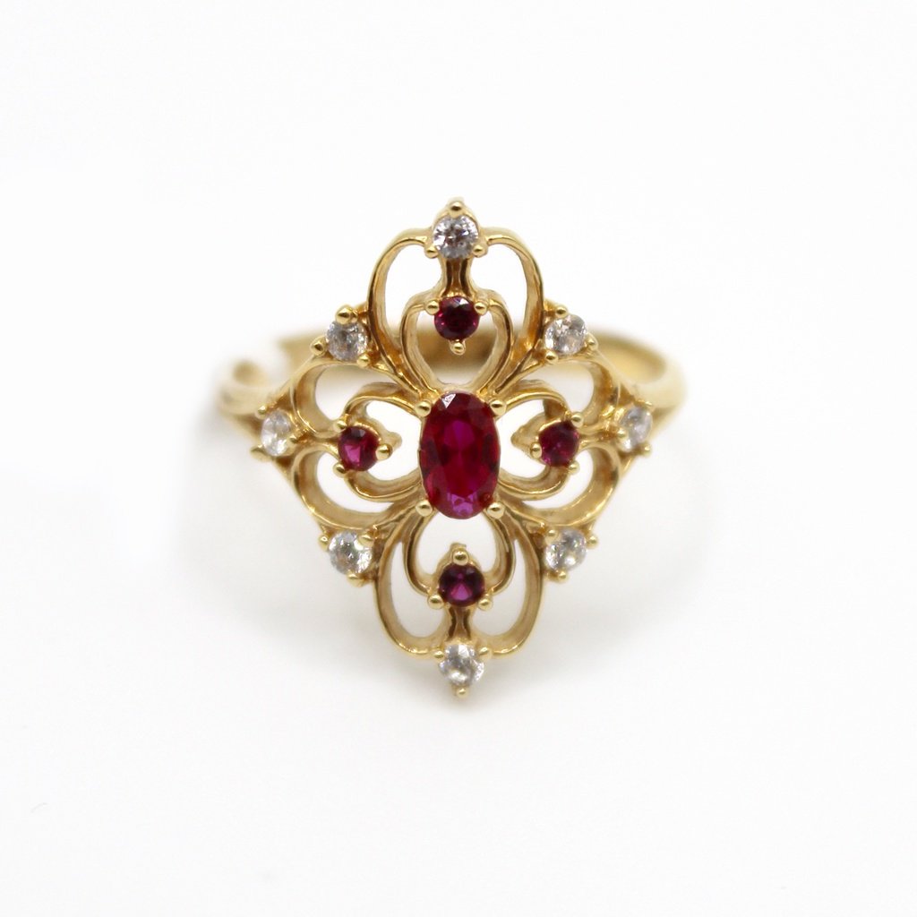 This exquisite 14KT gold ring features a detailed filigree pattern, elegantly arranged with vibrant red stones at the center and accented by sparkling white stones. Its intricate floral-inspired motif makes it a striking piece of fine jewelry, perfect for adding sophistication to any outfit. Whether worn as a statement ring or given as a meaningful gift, this design captures timeless beauty and elegance.