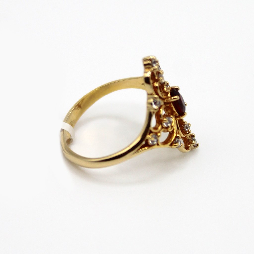 A 14KT gold ring with a striking red stone centerpiece, surrounded by intricate floral filigree and white stone accents.