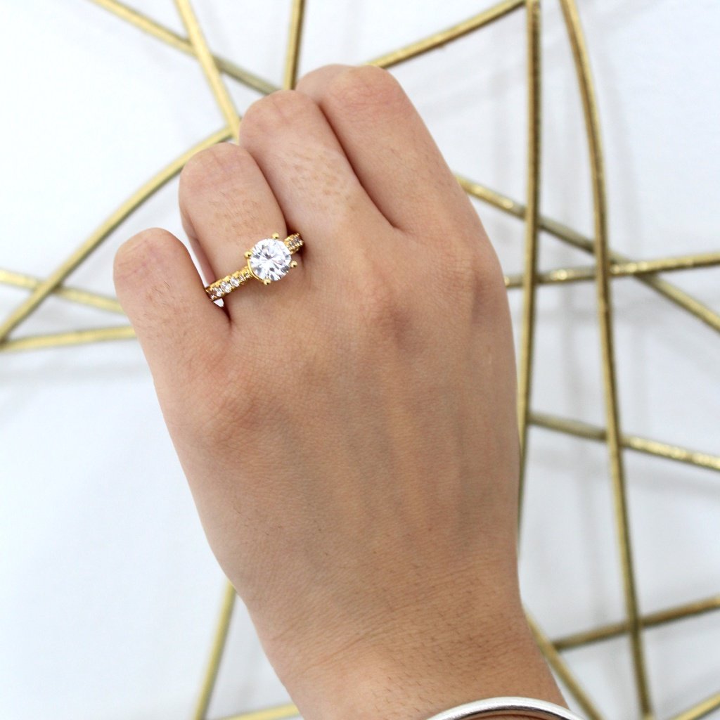 This timeless engagement ring is crafted in 14KT gold and features a brilliant round cut zirconia as the centerpiece. The band is adorned with a row of sparkling stones, adding depth and radiance to its classic design. Perfect for engagements or as a special statement piece, this ring combines luxury with affordability.