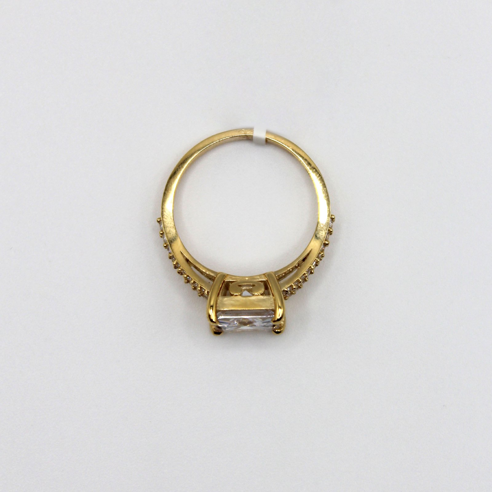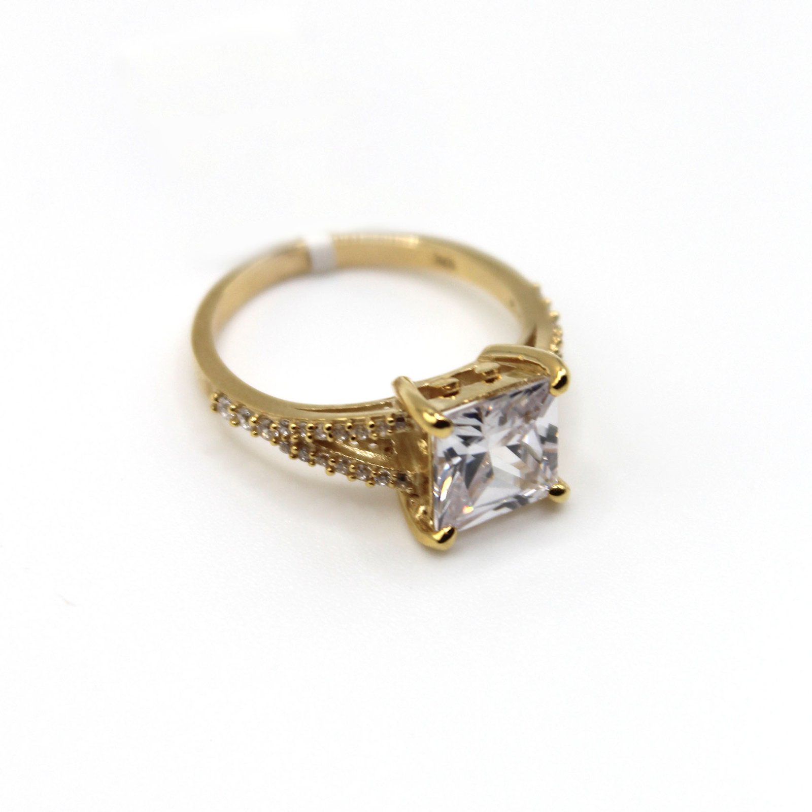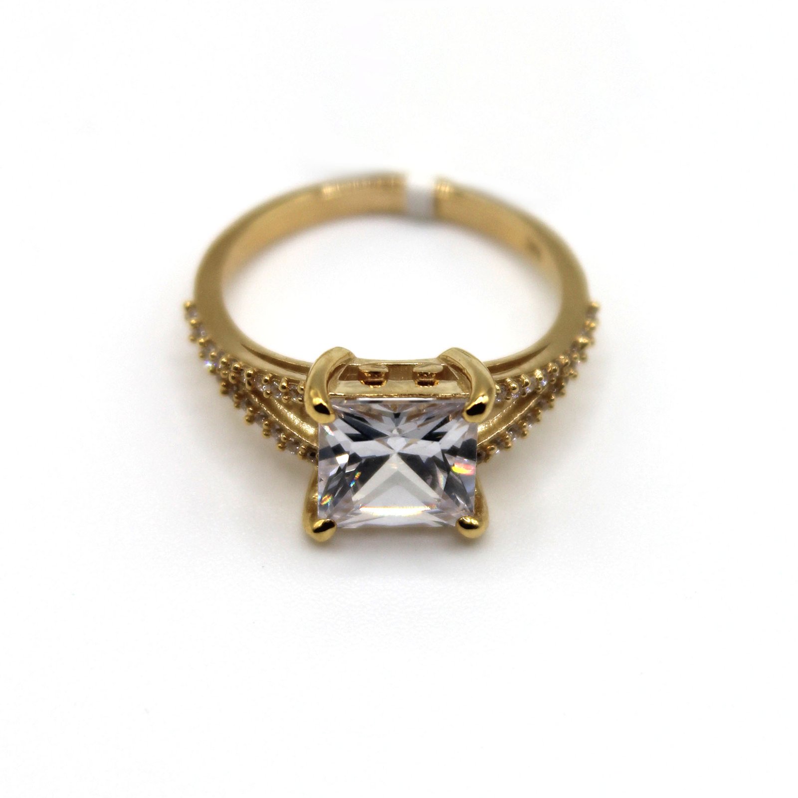 Crafted in warm 10KT yellow gold, this women’s engagement ring offers maximum brilliance and a luxurious appearance. The focal point is a large, square or cushion-cut white center stone that is securely held by four polished gold prongs. The band features a split-shank design on each side, with multiple rows of small, brilliant white stones meticulously pave-set along the shoulders. This combination of a dramatic solitaire and sparkling accents creates a dazzling, contemporary statement piece perfect for a proposal or as a special occasion ring.