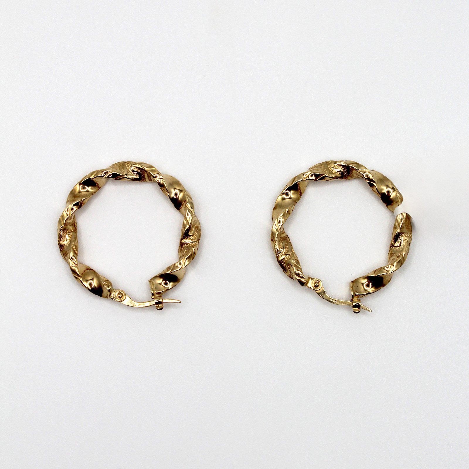 Crafted in warm 10KT yellow gold, these women’s hoop earrings offer an artistic, textured twist on a classic design. The round silhouette features a wide, twisted band, but the surface is finished with a heavily detailed, rough or hammered pattern. This distinctive finish provides deep dimension and a stylish, organic contrast to polished jewelry. Secured with a durable hinged closure, these comfortable hoops are perfect for adding character, texture, and a high-end, contemporary feel to your daily style.