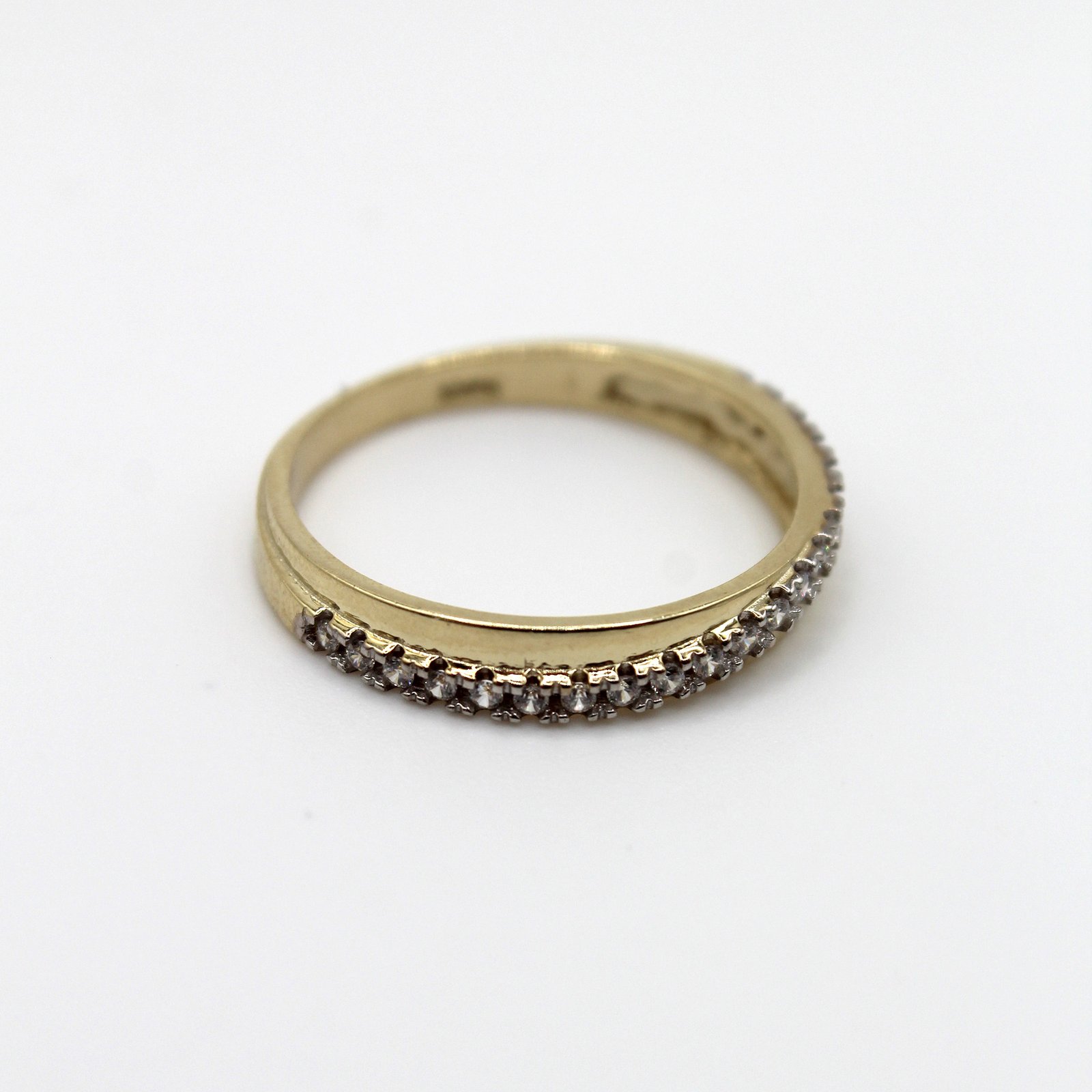 Crafted in warm 10KT yellow gold, this men’s band offers a refined look suitable for an engagement or wedding ring. The band features a smooth, polished gold profile with one edge set with a continuous row of small, sparkling white stones. This pave setting maximizes the ring’s brilliance and creates a subtle, shimmering contrast against the high-polish gold. The durable design is comfortable for continuous everyday wear and serves as an elegant, contemporary alternative to a traditional solid band.