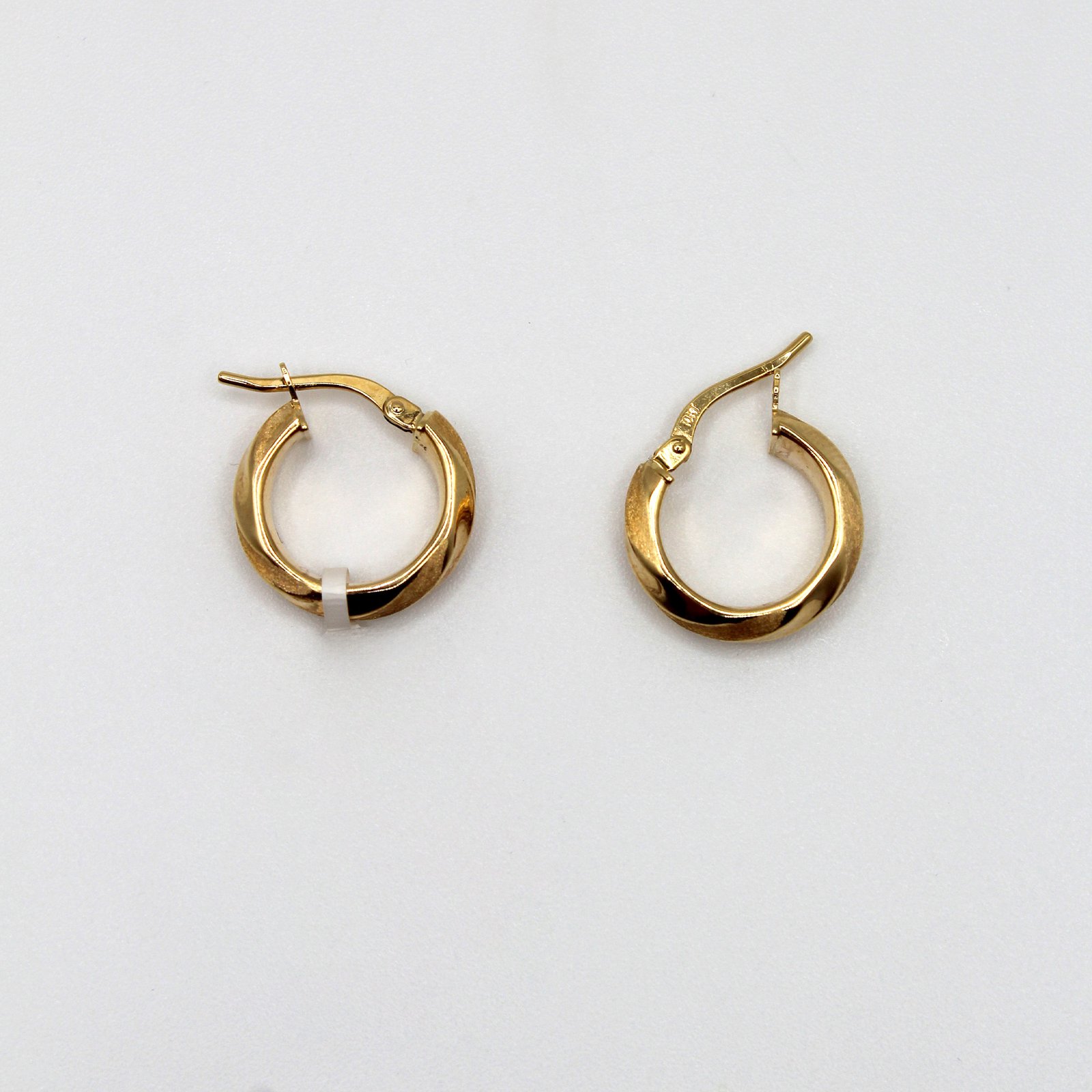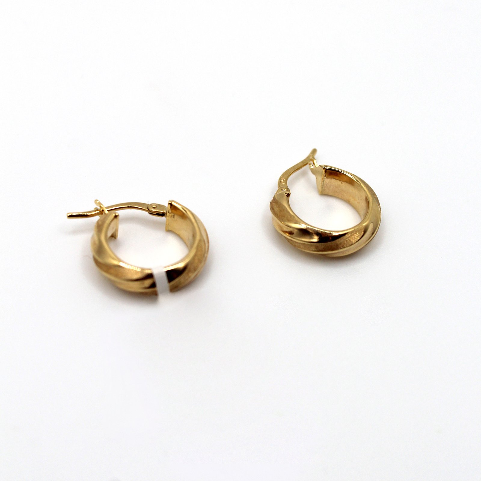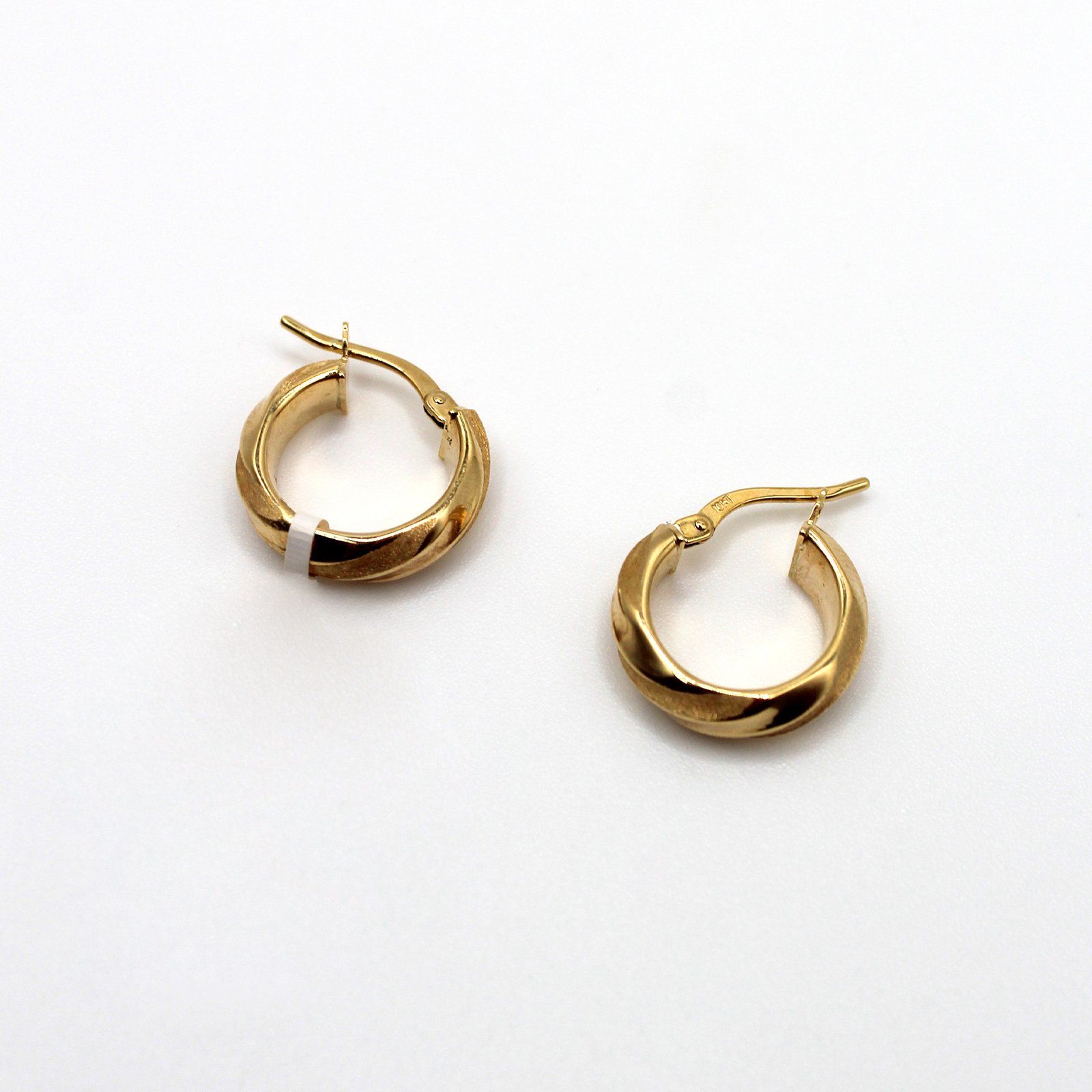 Crafted in warm 10KT yellow gold, these women’s earrings are an elegant choice for everyday wear. They feature a small, huggie-style silhouette that fits closely to the earlobe. The rounded, slightly domed surface is distinguished by a soft, subtle twist, which adds a gentle texture and continuous reflection of light. Secured with a durable, integrated hinged closure, these polished hoops are perfect for a minimalist look, second piercings, or for those who prefer a comfortable, close-fitting design with a touch of sophistication.