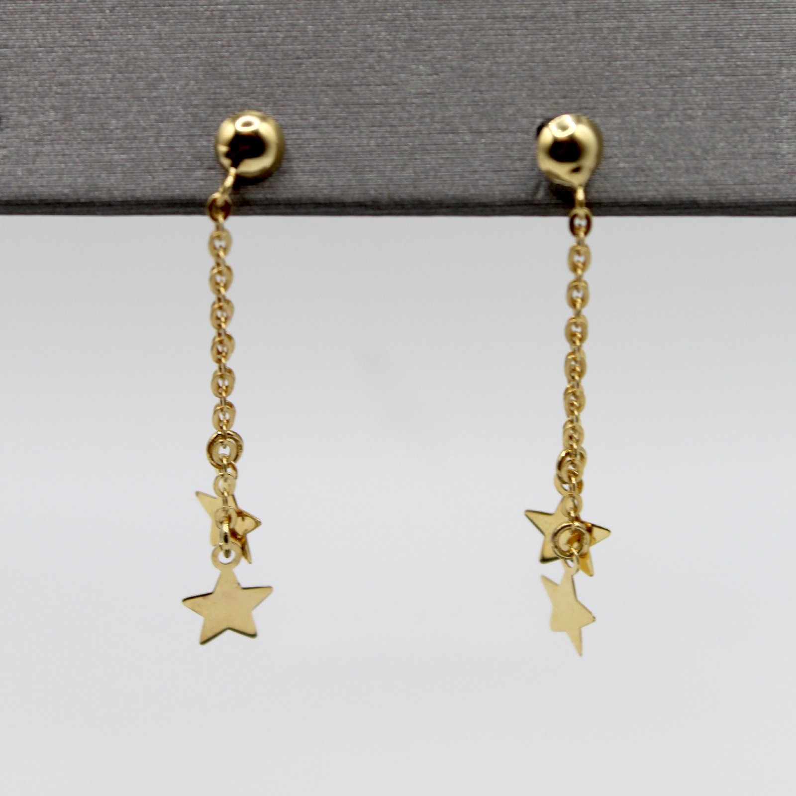 Crafted in radiant 14KT yellow gold, these women’s earrings offer a chic and celestial-inspired design. The earrings are secured with a simple ball or dome stud post at the earlobe. A delicate fine chain suspends gracefully from the post, finishing with two flat, high-polish star charms of varying sizes that create playful movement. This long drop style is modern and feminine, perfect for adding subtle sparkle and a contemporary edge to any look. They are lightweight and ideal for both everyday wear and dressing up a sophisticated evening ensemble.