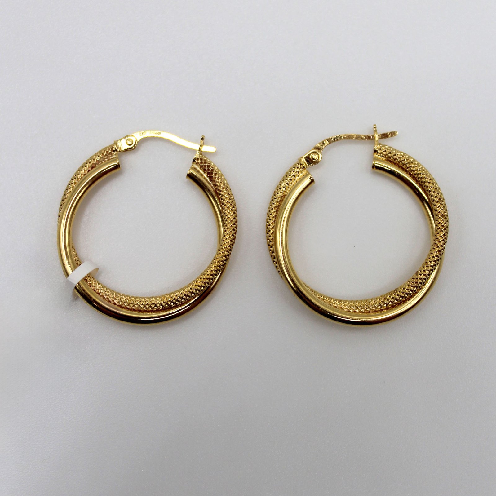 Crafted in warm 10KT yellow gold, these women’s earrings offer a traditional yet dynamic look. The hoops feature a comfortable, mid-size diameter and a substantial rounded profile. The outer surface of the hoop is divided into two distinct finishes: the front section is covered in a fine, intricate texture (like a diamond-cut or stippled pattern) designed to maximize sparkle, while the inner surface and back retain a smooth, high-polish finish. Secured with a hinged closure for comfortable wear, these hoops are perfect for adding volume and a continuous textured golden shimmer to any outfit.