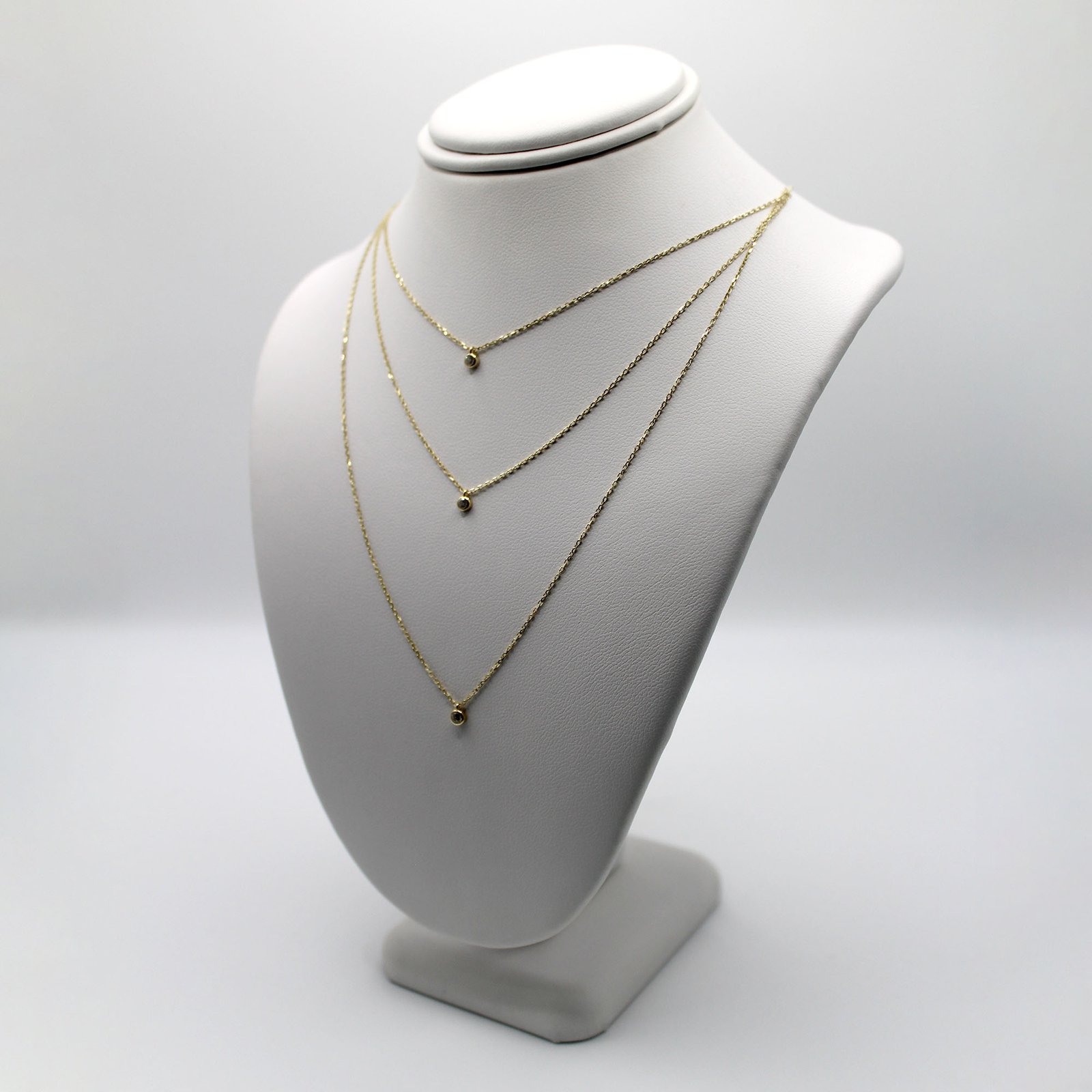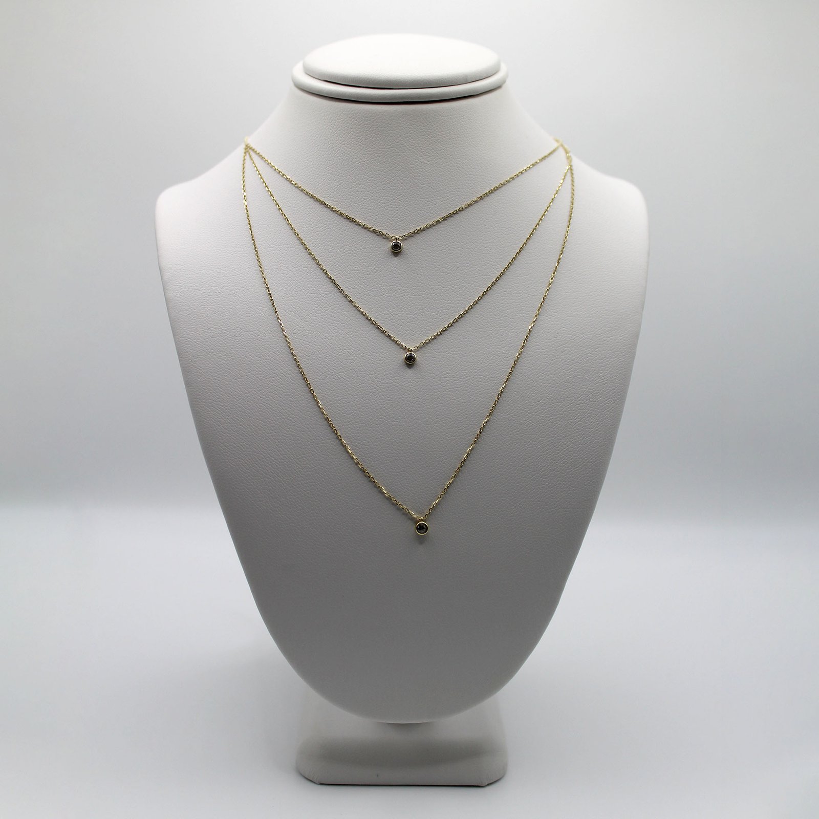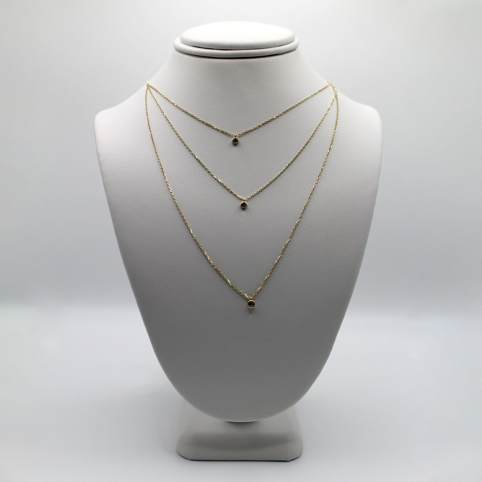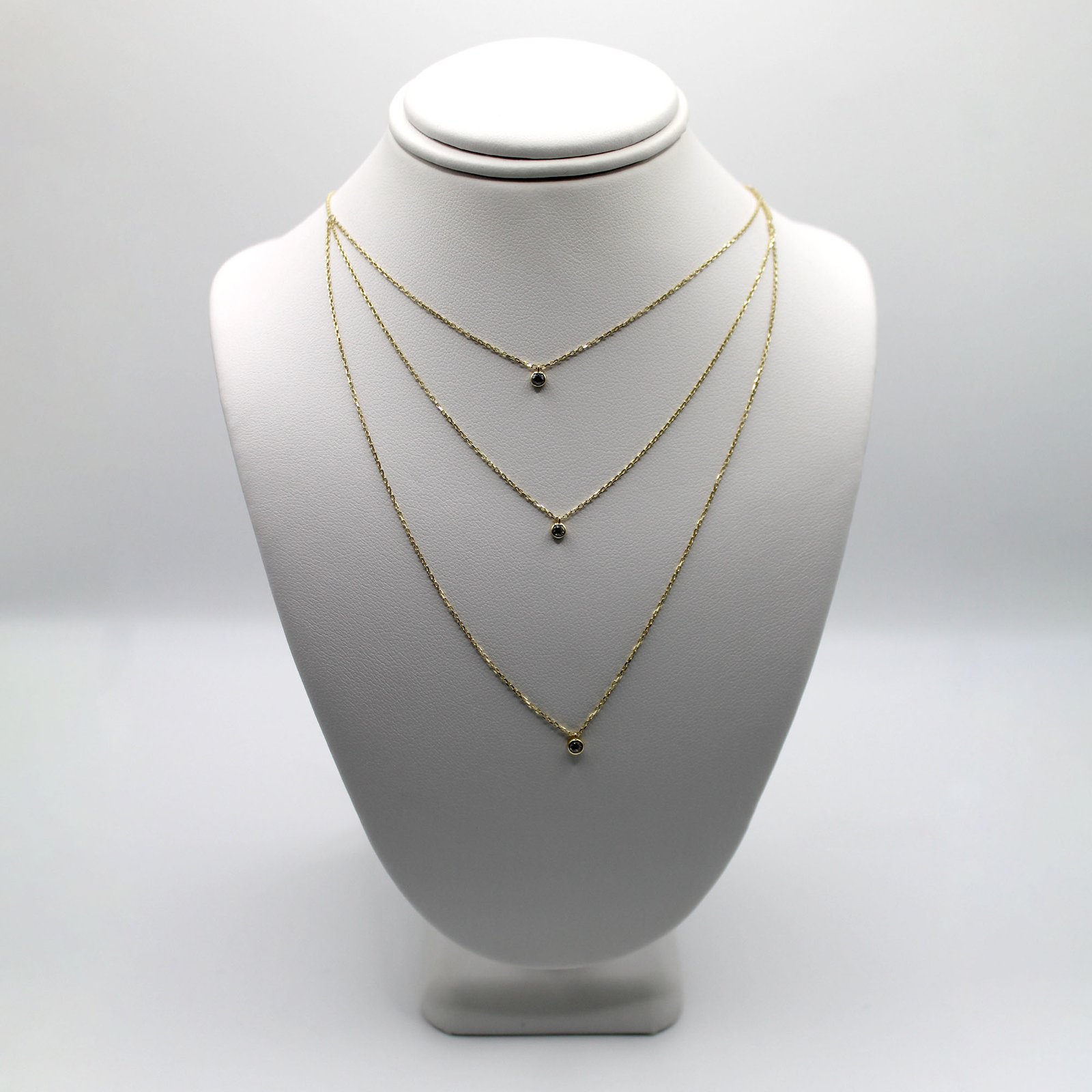Crafted in warm 10KT yellow gold, this women’s necklace offers a fashionable, ready-to-wear layered look. The design features three delicate link chains of graduated lengths, creating a perfectly spaced cascade. Each chain is accented at its drop with a small, bezel-set black color stone, providing subtle contrast and minimalist sparkle. This necklace is lightweight and comfortable for continuous wear, and it eliminates the need to layer multiple separate pieces. It is ideal for adding a contemporary, dainty shimmer to any outfit.