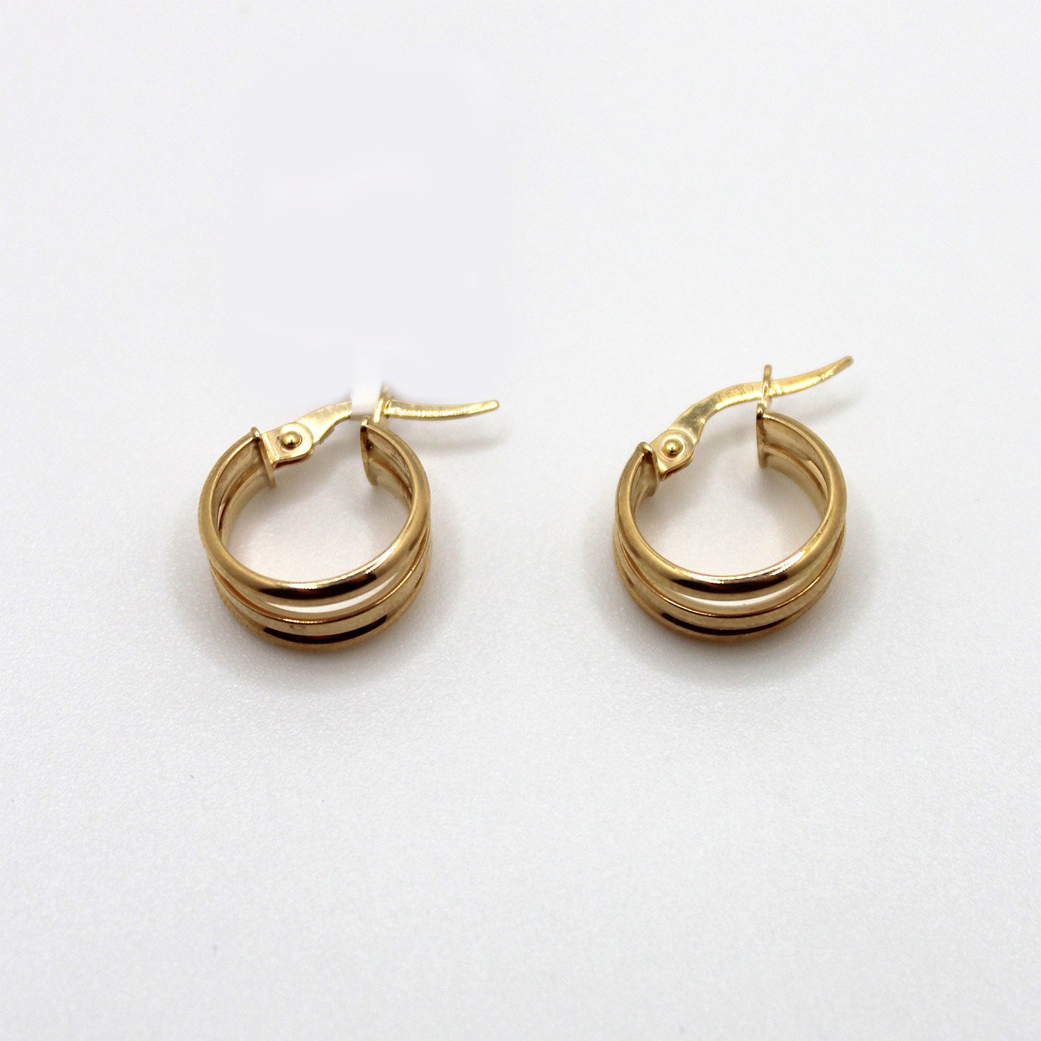 A classic pair of 10KT yellow gold hoop earrings featuring a thick triple-row design with a shiny, polished finish.