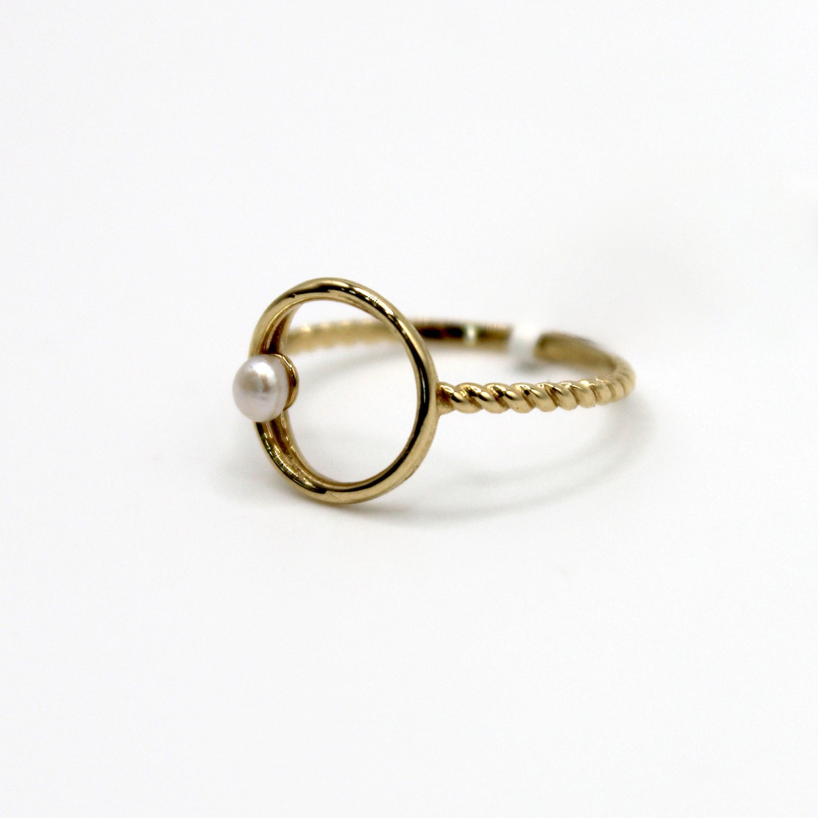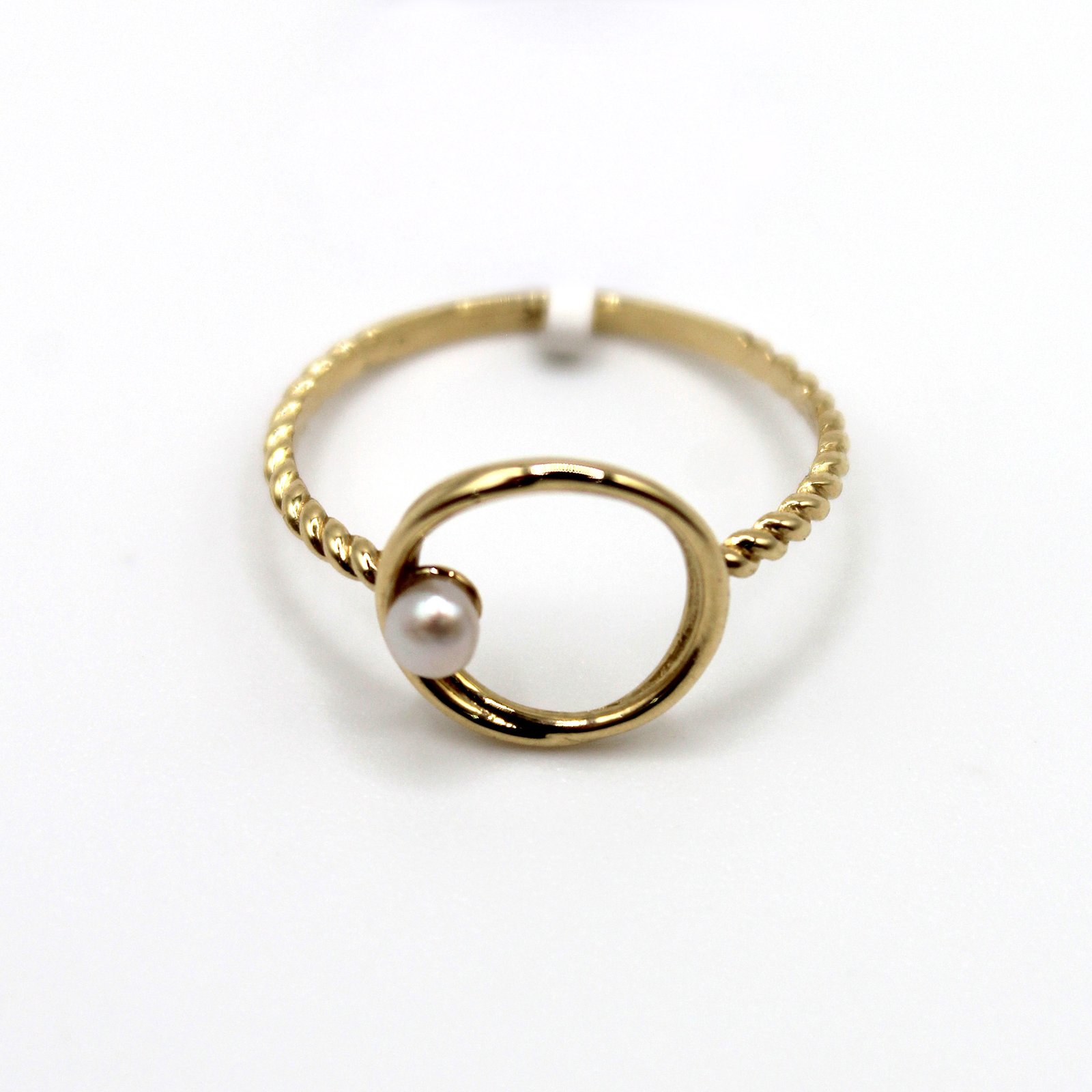 Crafted in radiant 14KT yellow gold, this women’s ring offers a modern, artful design. The ring’s band features a fine twisted rope texture, adding subtle dimension. The centerpiece is a sleek, polished gold open circle that stylishly encircles a small, lustrous pearl. The pearl is positioned off-center within the circle, creating a contemporary, floating effect. This dainty ring is perfect for everyday wear, effortlessly combining timeless elegance with minimalist design. It can be worn alone as a refined accent or seamlessly stacked with other rings.