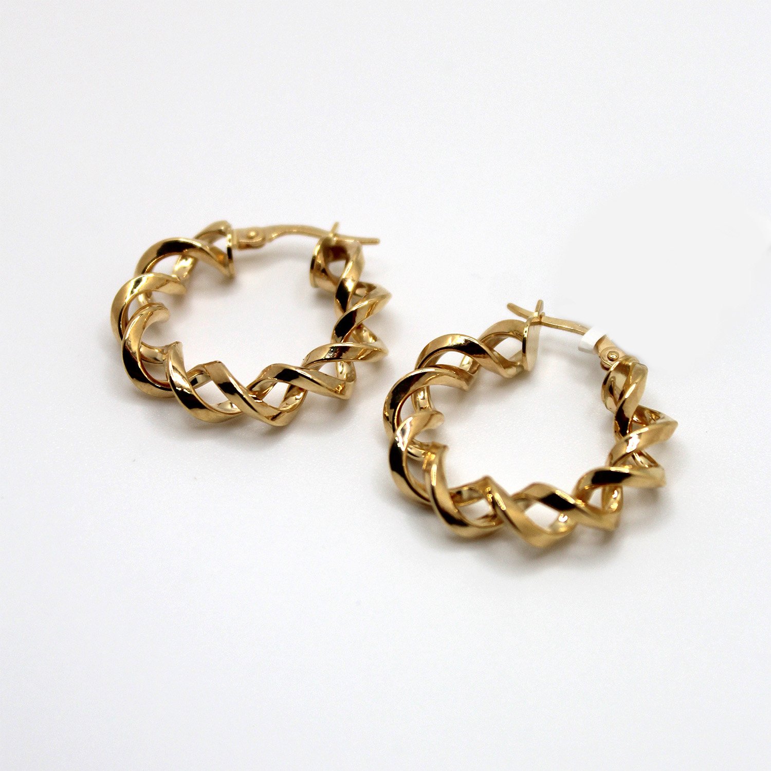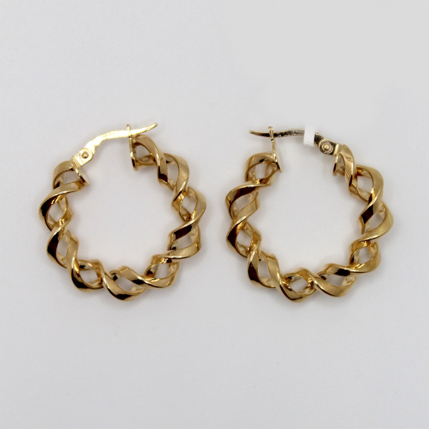 A stylish pair of 10KT yellow gold hoop earrings featuring a thick, twisted design with a high-polish finish.