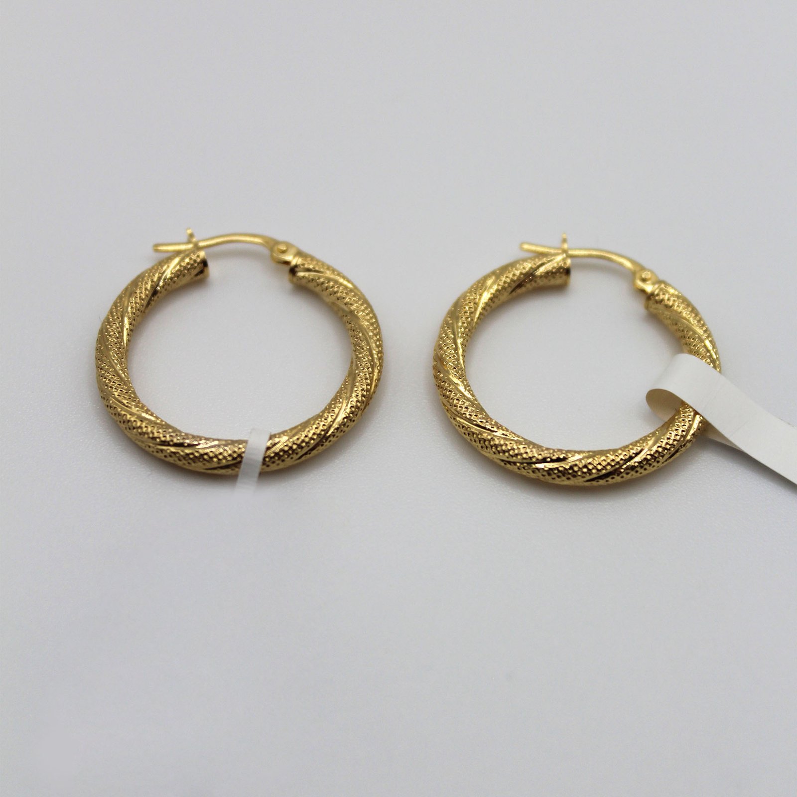 Crafted in warm 10KT yellow gold, these women’s earrings offer a small, chunky, and detailed look. The hoops have a small diameter, perfect for a huggie fit, and a substantial rounded profile. The entire outer surface is covered in an intricate twisted texture (appearing like a detailed weave or diamond-cut finish) that maximizes their shimmer and light reflection. Secured with a durable hinged closure, these everyday hoops are perfect for adding volume and a textured golden sparkle to any outfit.