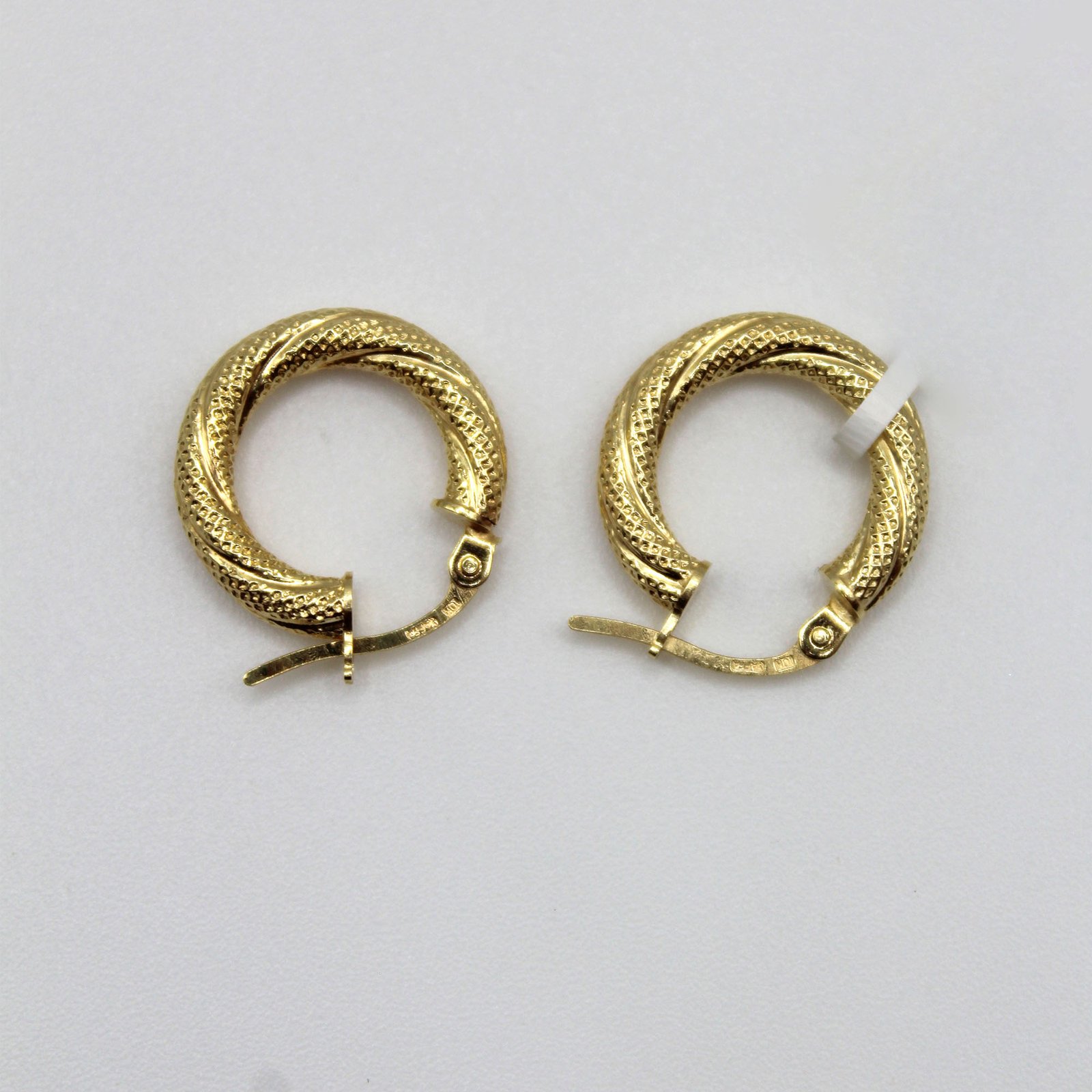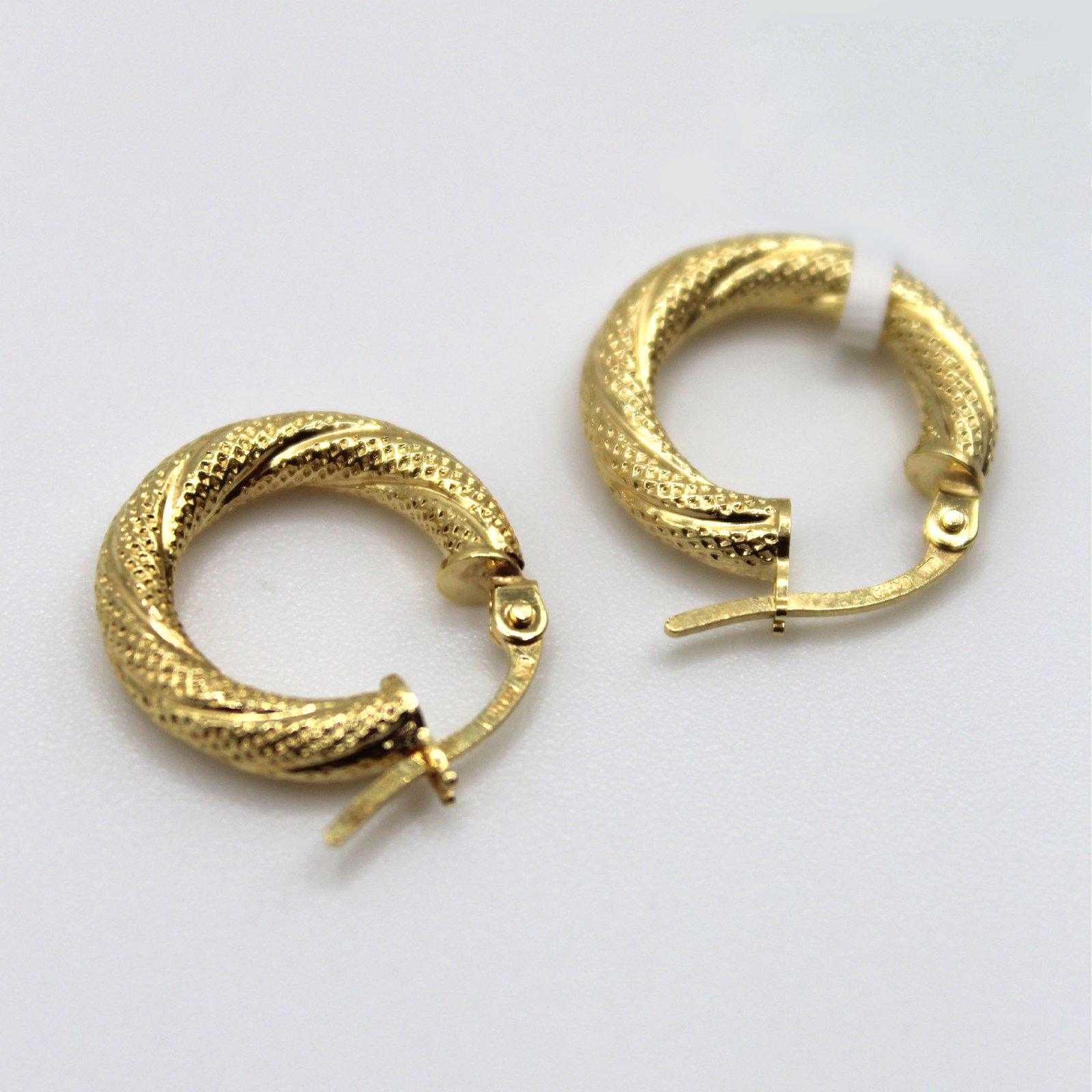 Crafted in warm 10KT yellow gold, these women’s earrings offer a small, chunky, and detailed look. The hoops have a small diameter, perfect for a huggie fit, and a substantial rounded profile. The entire outer surface is covered in an intricate twisted texture (appearing like a detailed weave or diamond-cut finish) that maximizes their shimmer and light reflection. Secured with a durable hinged closure, these everyday hoops are perfect for adding volume and a textured golden sparkle to any outfit.