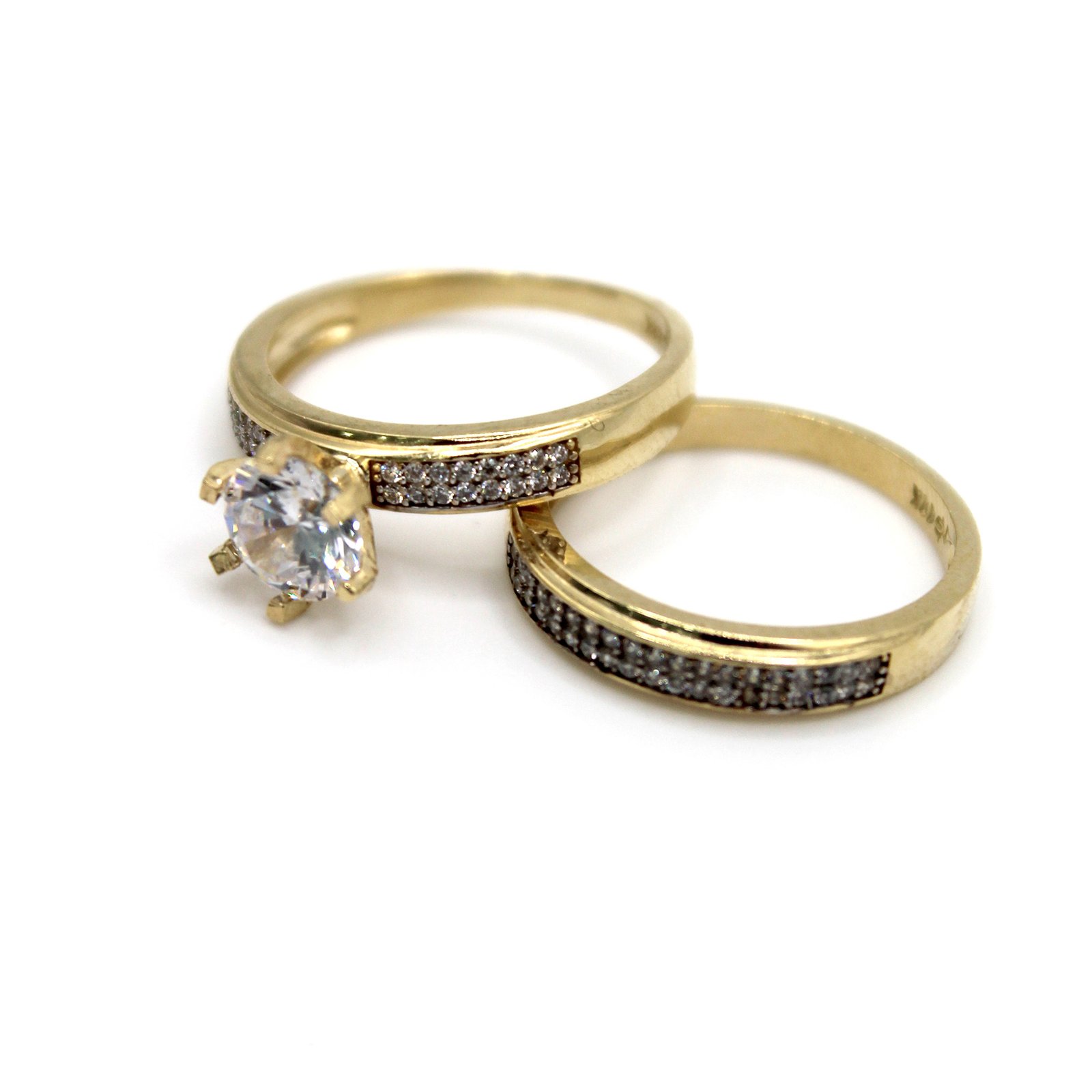 Crafted in warm 10KT yellow gold, this women’s bridal set offers classic style and brilliant sparkle. The engagement ring features a prominent, brilliant round-cut white stone center, held securely by a prong setting. The shank of the engagement ring, along with the entire coordinating wedding band, is set with continuous rows of small pave-set white stones. When worn together, the two rings create a voluminous, shimmering look, maximizing the stone surface area. This comfortable and elegant set is the perfect choice for an engagement and wedding band combination, offering enduring style and continuous brilliance.