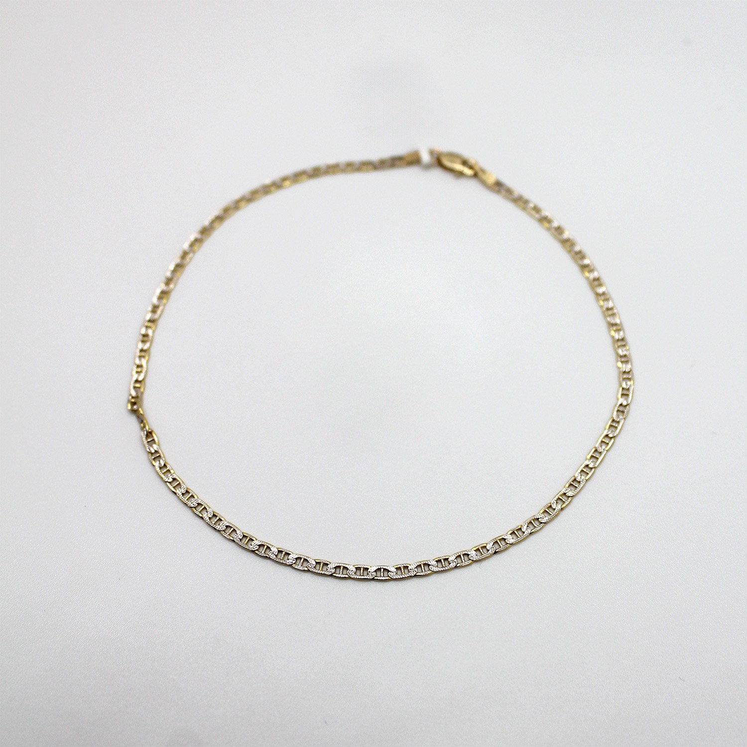 A stylish 10KT yellow and white gold anklet measuring 10 inches in length, featuring flat mariner links with diamond-cut textures.