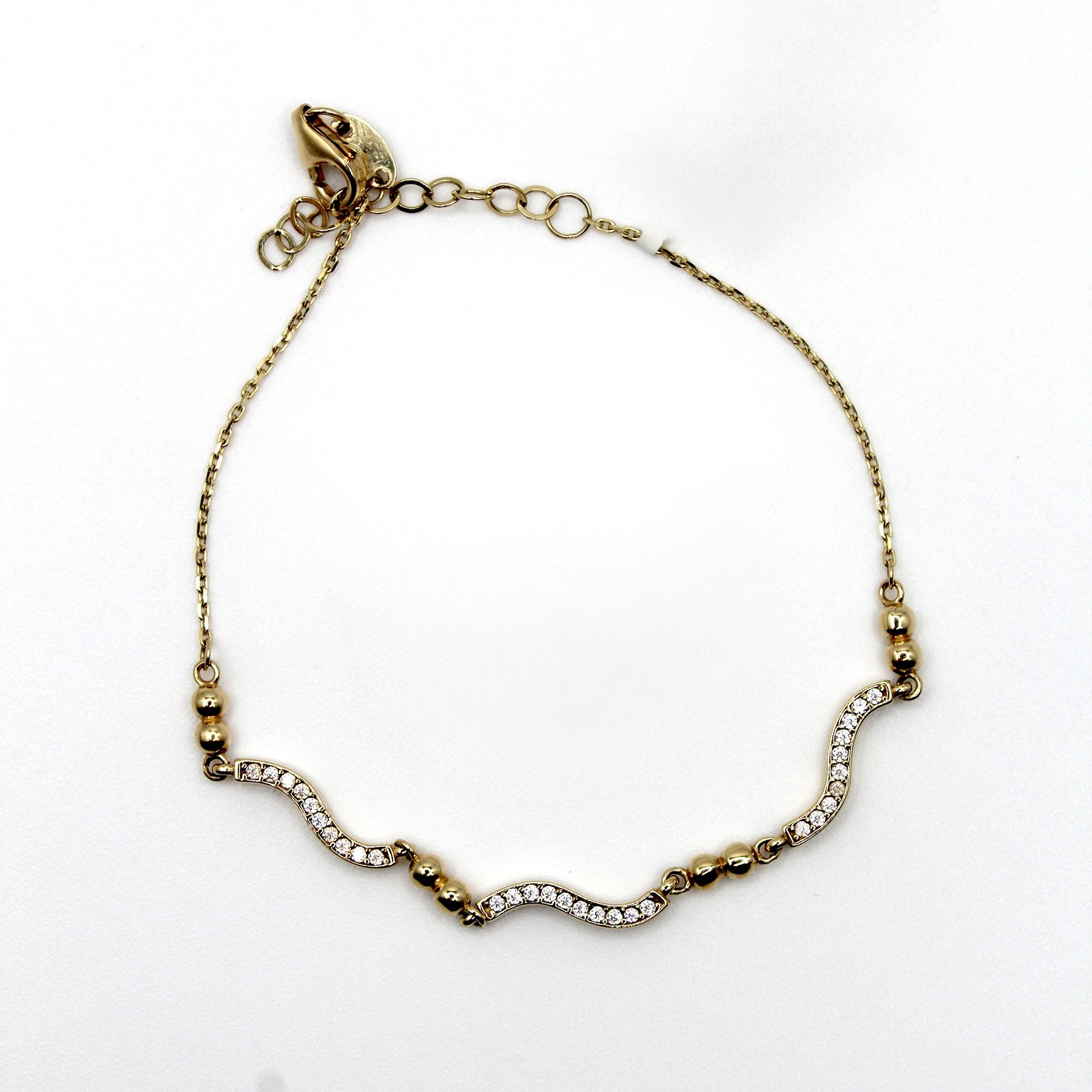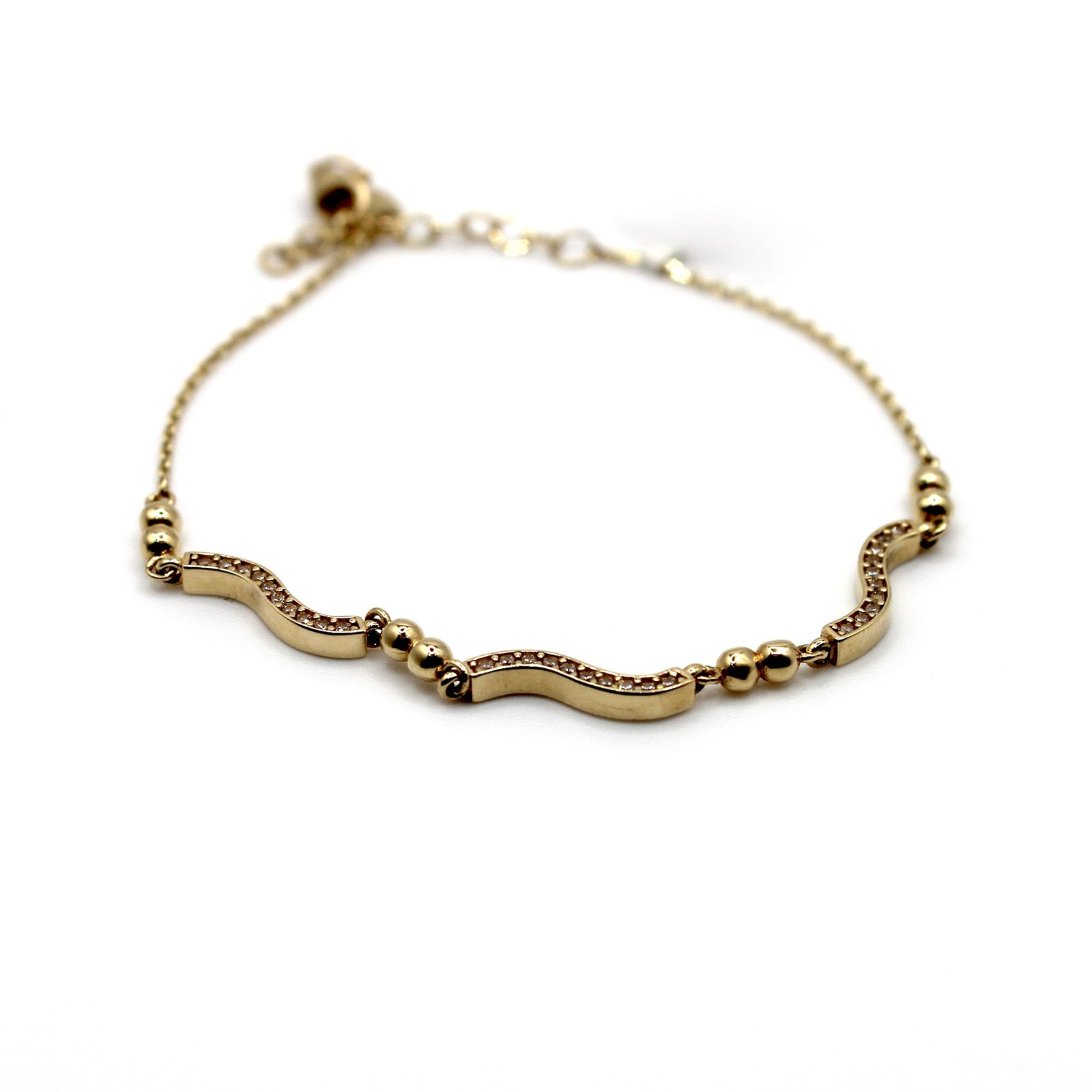 Crafted in high-quality 14KT yellow gold, this women’s bracelet offers a contemporary and sophisticated design. The delicate chain is accented by small, round gold beads, leading to a gracefully curved center station. This station is subtly paved with sparkling white stones, creating a beautiful wave of brilliance that catches the light. Finished with an adjustable chain and a secure clasp, this bracelet is perfect for adding a touch of feminine elegance to both professional and evening wear. Its subtle sparkle makes it a perfect piece for stacking or wearing on its own.
