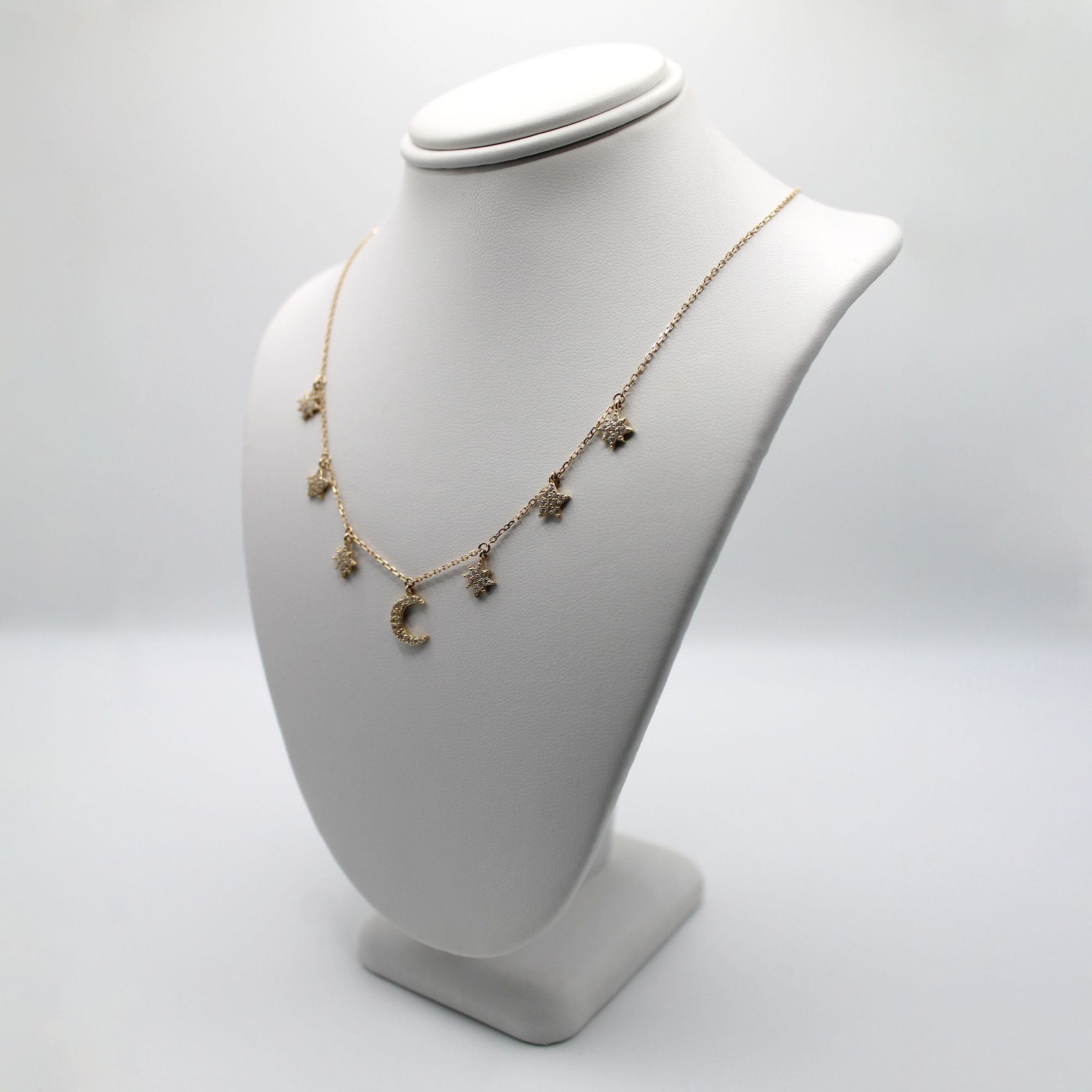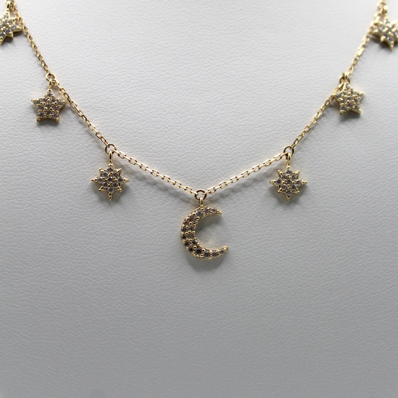 A stunning 14KT gold necklace featuring a central pave-set crescent moon and several small star charms set with sparkling white stones dangling along the front.