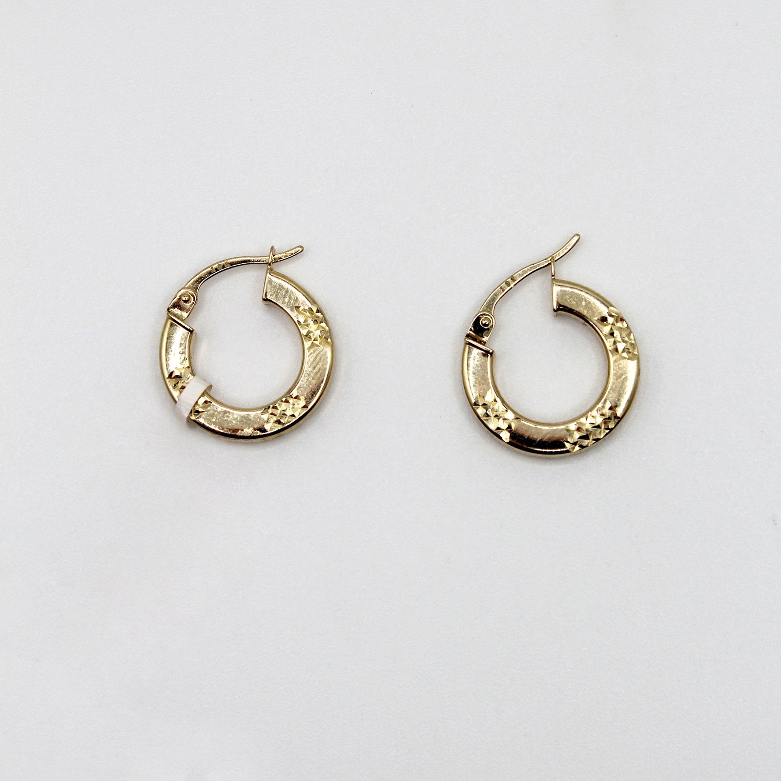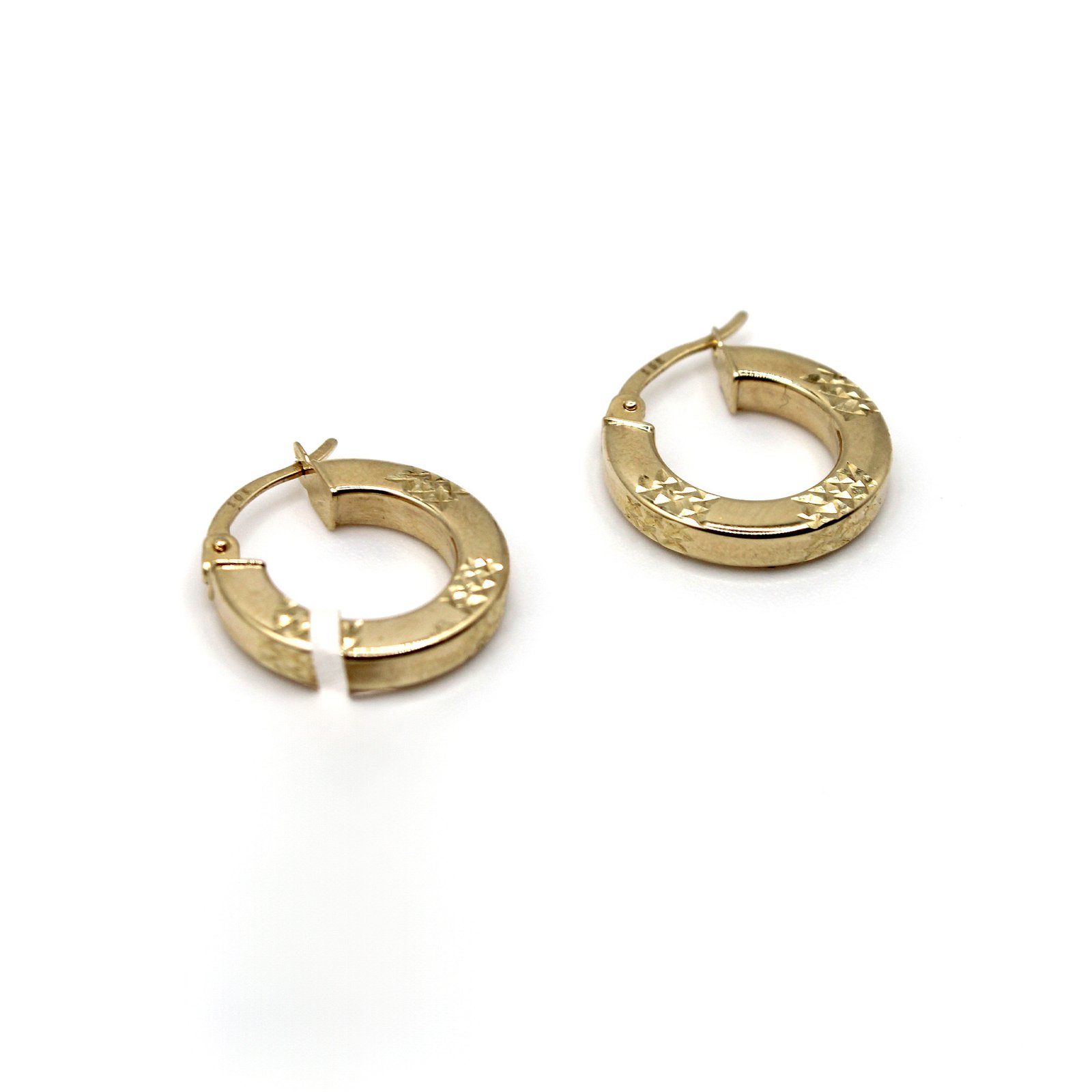 Crafted in warm 10KT yellow gold, these women’s earrings are a modern take on the huggie style. The wide, comfortable silhouette fits closely to the earlobe. The smooth, polished surface is punctuated by diamond-cut patterns—likely a star or diamond shape—that beautifully contrast the polished gold and maximize light reflection. Secured with a durable, integrated hinged closure, these everyday hoops are perfect for adding volume, texture, and sophisticated shine to any look.