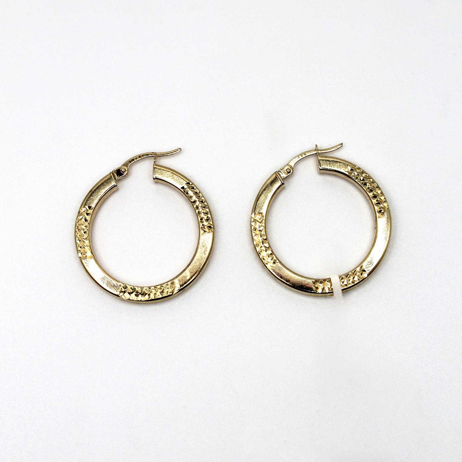 Crafted in warm 10KT yellow gold, these women’s hoop earrings offer a sleek, updated take on the classic design. They feature a wide, flat band that creates a bold, geometric profile. The surface is punctuated by alternating patterns of smooth, reflective gold and intricate diamond-cut accents, which beautifully catch the light and add non-stone sparkle. Secured with a durable hinged closure, these stylish hoops are perfect for adding structure and sophisticated shine to any outfit.