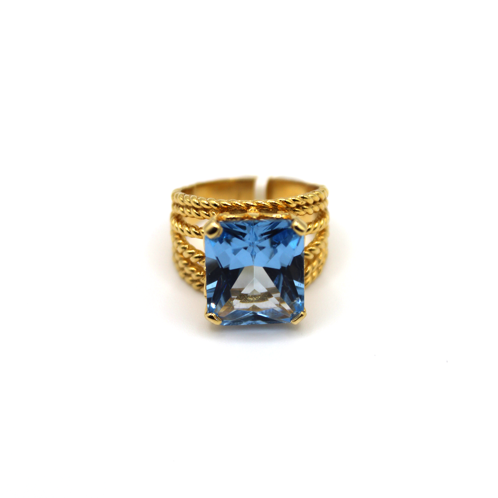 Crafted in 10KT gold, the Blue Radiance Ring features a brilliant blue stone framed by intricate gold detailing. Its bold design and radiant sparkle make it a true statement of elegance and sophistication.