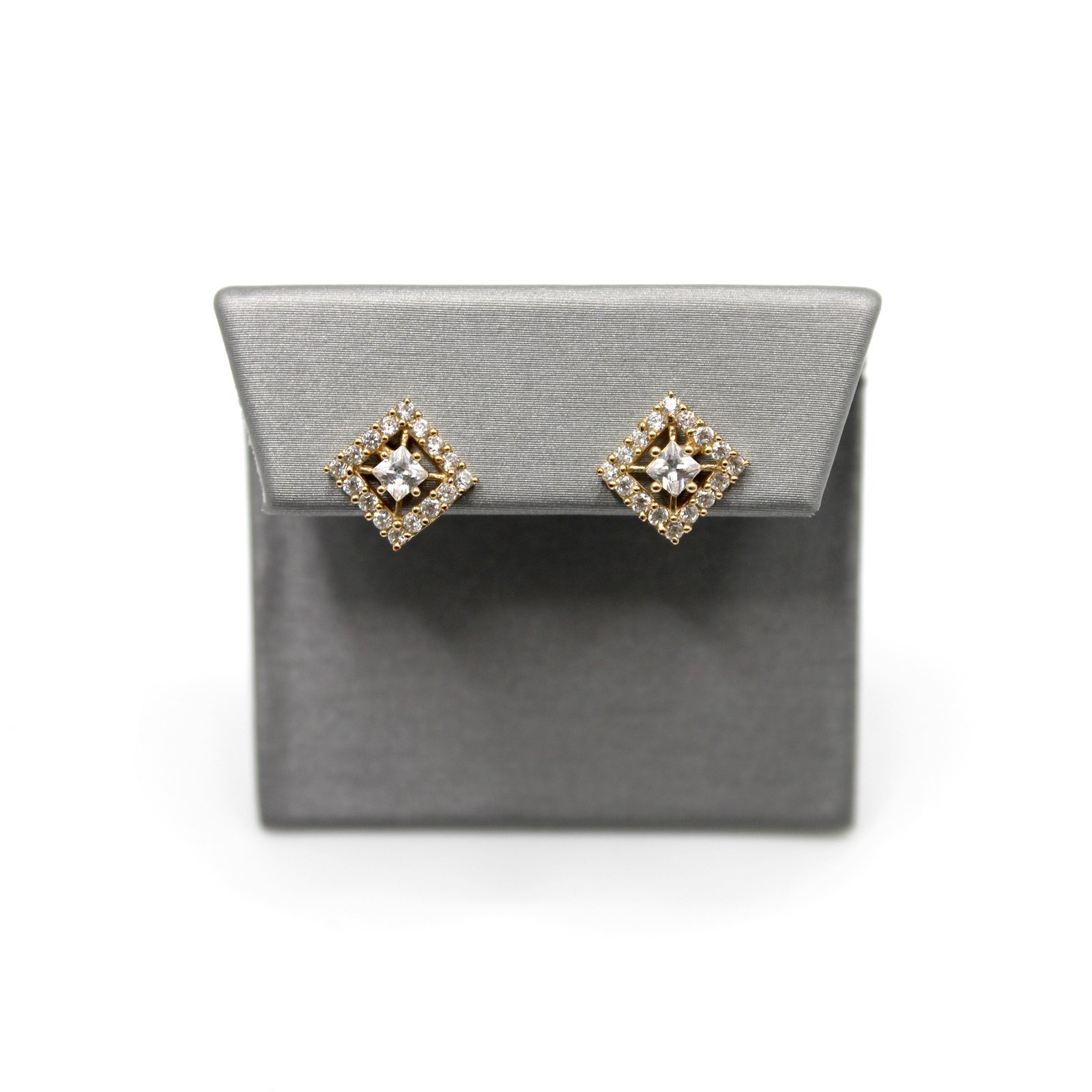 Sparkling 14KT gold stud earrings featuring a geometric cluster of brilliant zirconia stones set in a diamond (square on point) shape.