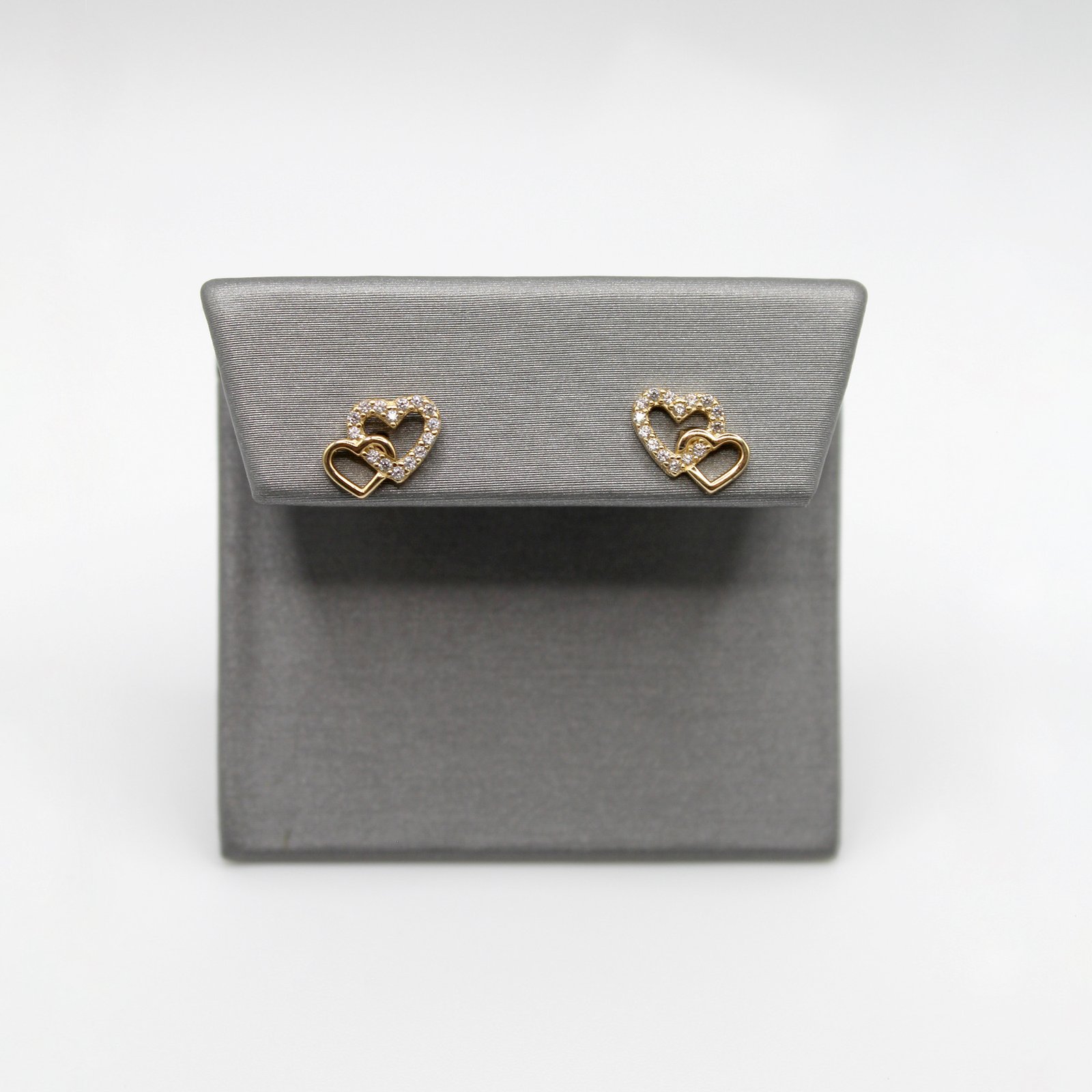 These beautifully crafted 14KT gold stud earrings symbolize connection and enduring love with their sweet double heart design. One heart is finished in polished gold, while the other is set with brilliant zirconia stones for a captivating sparkle. This delicate contrast adds depth and elegance to the piece. Lightweight and comfortable, they are perfect for everyday wear and make a truly thoughtful and meaningful gift for a loved one.