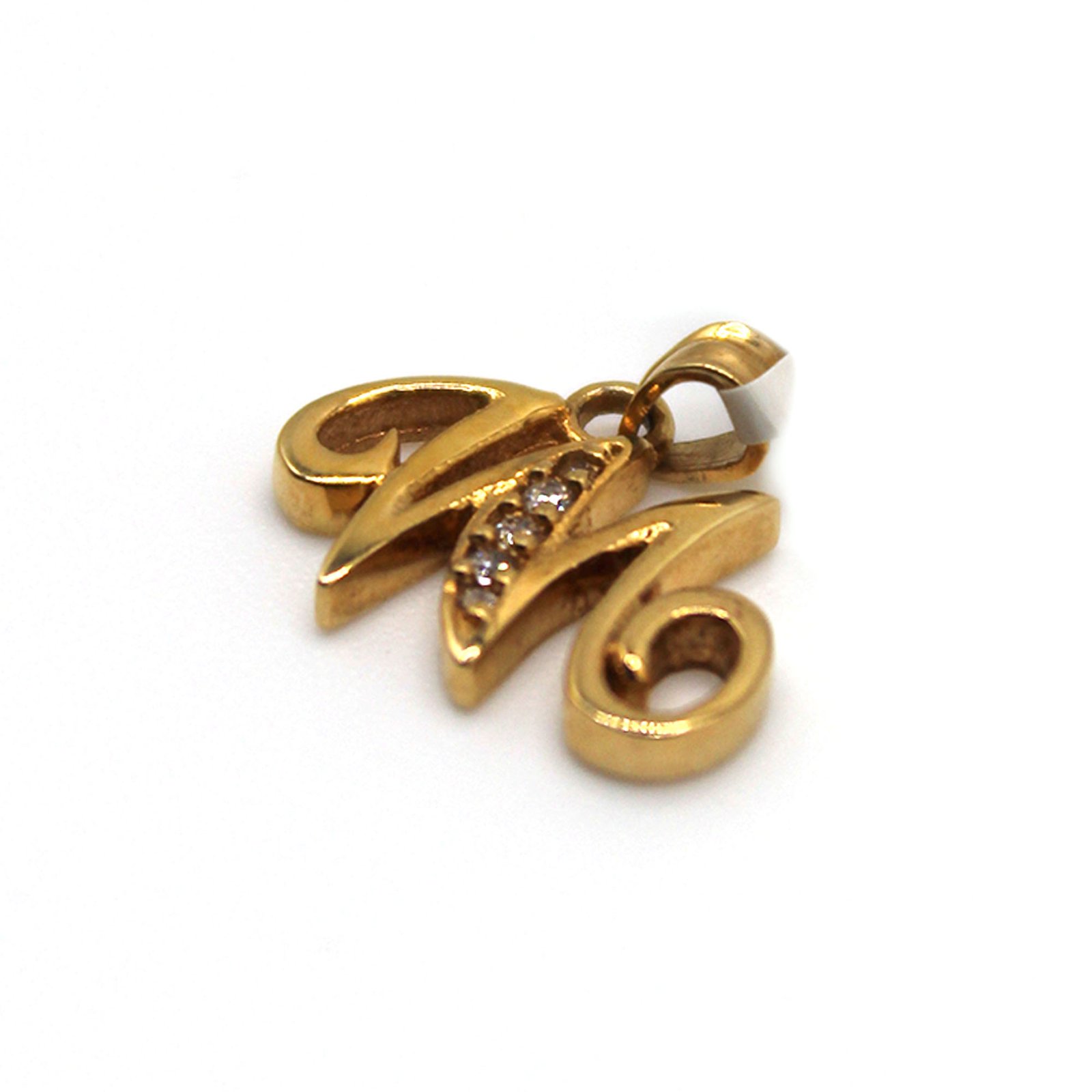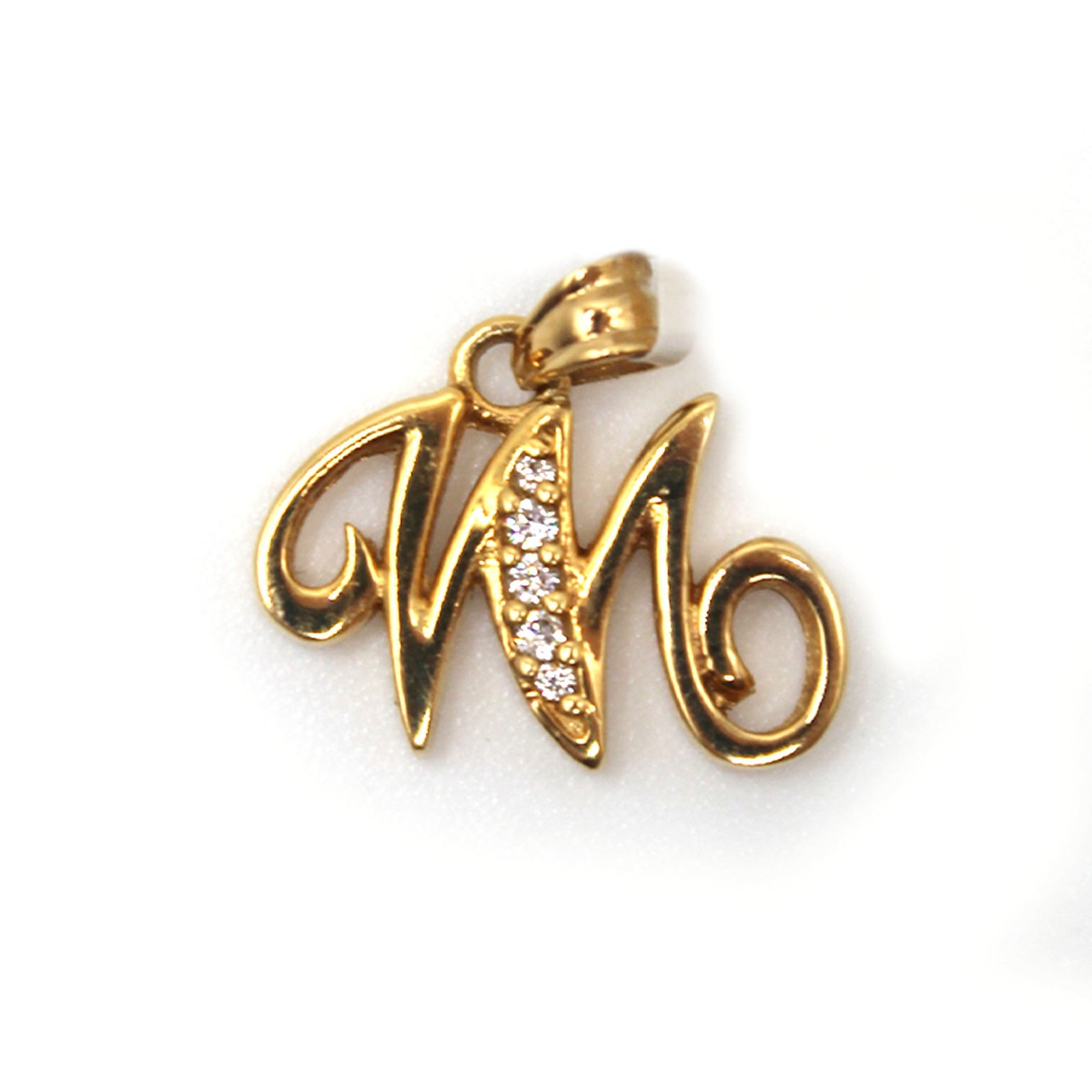 A 10KT yellow gold pendant featuring the initial “M,” accented with sparkling zirconia stones.
