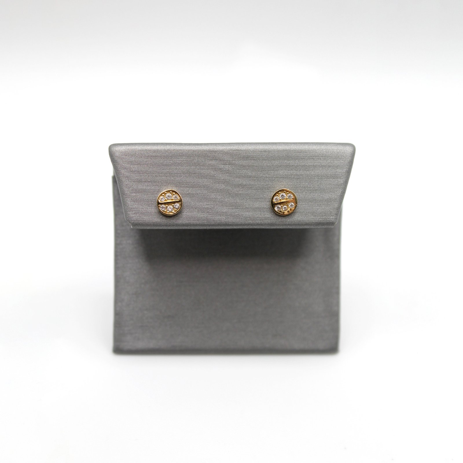 These delicate 14KT gold stud earrings feature a small disc shape that is partially set with sparkling zirconia stones, creating a dazzling micro-pave effect. The design is subtly segmented by a smooth line of gold, giving the piece a contemporary and unique visual appeal. Their small size and brilliant sparkle make them an excellent choice for subtle everyday wear, and they are lightweight and comfortable. These versatile studs are perfect for a main piercing or for layering in a curated ear stack.