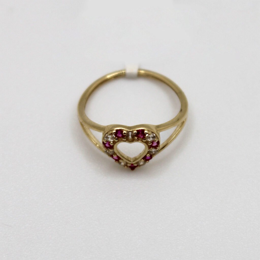 Floral Filigree Red Stone Ring with Clear Accents – 10KT Gold, Size 7.5