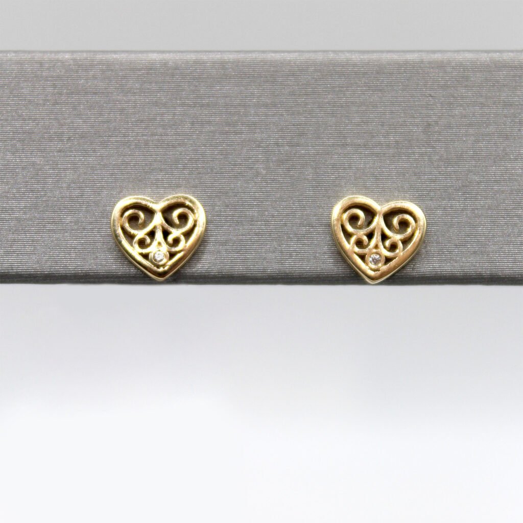 Filigree Heart Stud Earrings with Diamond Accents – 14KT Yellow Gold